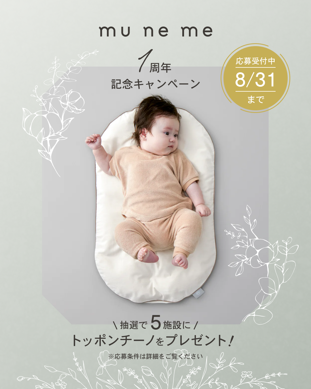 この1年間でオーガニックトッポンチーノをご使用した多くの方から、「本当にトッポンチーノがあってよかった」「触り心地がとても良い」というお声をいただき、大変嬉しく思っております。トッポンチーノを使用する赤ちゃんのお写真を拝見する度に、癒やしとパワーをいただいています。少しでもmu ne meのあたたかさをこの世界に誕生した赤ちゃんとその赤ちゃんの育ちを助ける大人の方に届けたいという思いで、今回の1周年記念プレゼントキャンペーンを実施することにいたしました。