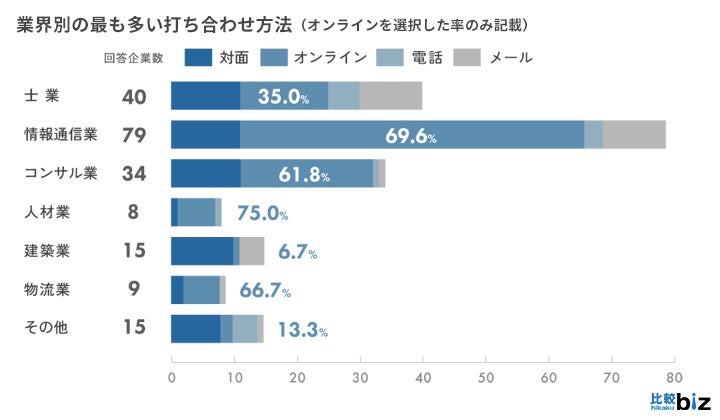 下図の業界別で見ると「士業」は「情報通信業」と比べ「メール」の割合が多く、「建築業」は「対面」が67%と、業界によって打ち合わせ方法が大きく異なることがわかります。