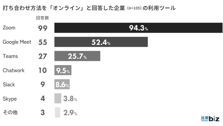 BtoB企業の打ち合わせは「オンライン」が主流の時代に。ツールのシェア1位は「Zoom」、2位は「Google Meet」の結果に|比較ビズ