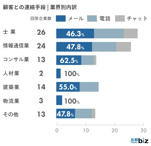 業界別でみると若干の差異があり、「士業」「情報・通信業」は「チャット」の比率が他業界より高めであることがわかります。