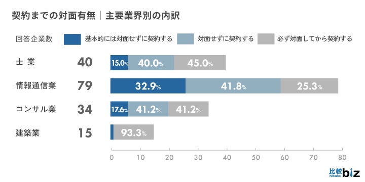 業界別で見ると「建築業」は93.3%が「必ず対面してから契約する」を選択しており、「士業」「コンサル業」は40%台、「情報通信業」は25.3%と低いことがわかります。