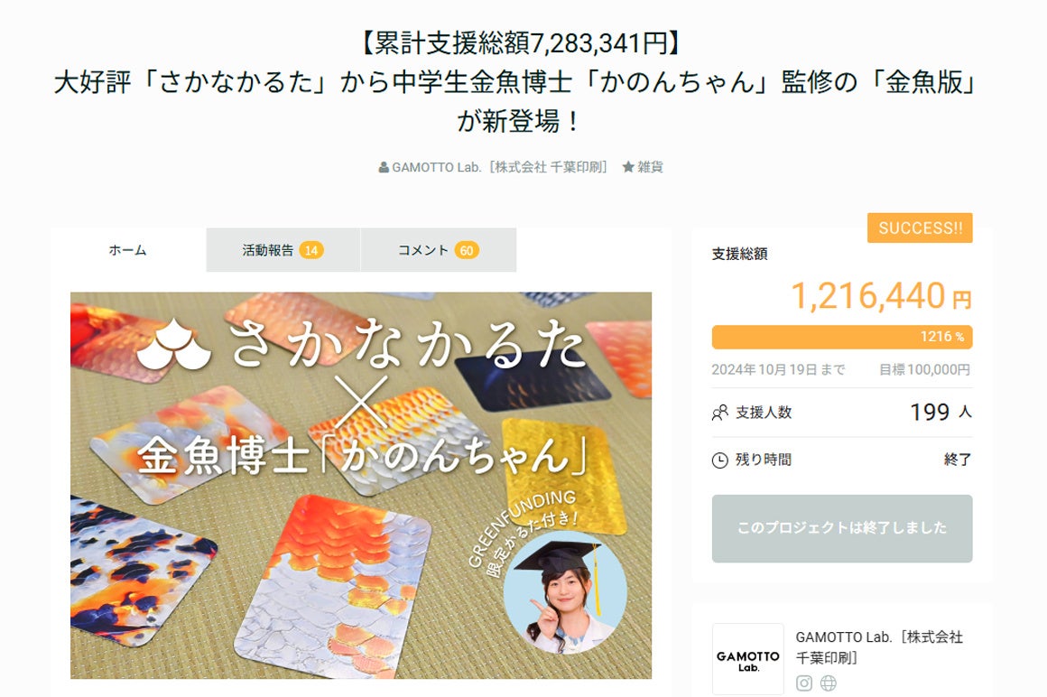 この度クラウドファンディングサイトにてシリーズ累計支援総額7,283,341円を達成した「さかなかるた」より、金魚博士「かのんちゃん」監修の「金魚かるた」を発売いたします。