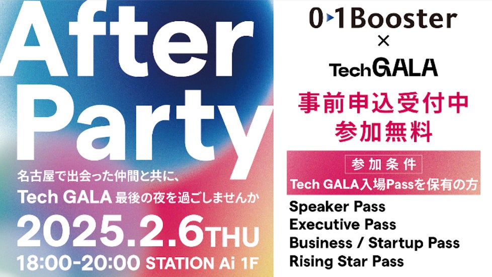 2月6日(木)の夜には、After Partyをご用意しました!名古屋で出会った仲間と共に、ぜひTech GALA最後の夜を過ごしませんか?皆さまのご参加をお待ちしています。