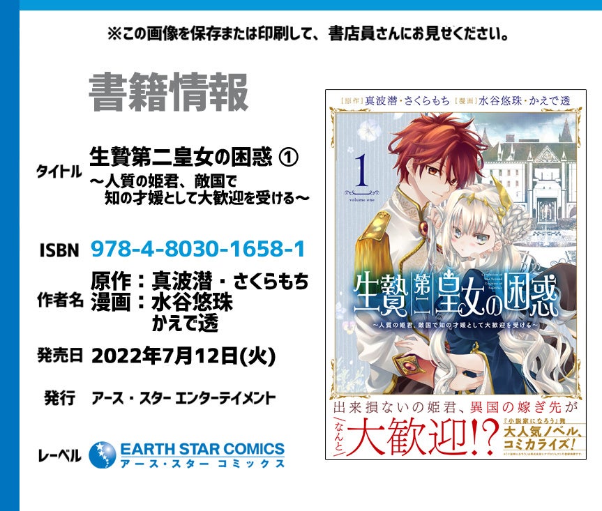 アース・スターノベルより刊行中の人気ノベル作品が原作で、現在コミック アース・スターで連載中の人気作品『生贄第二皇女の困惑 ~人質の姫君、敵国で知の才媛として大歓迎を受ける~』コミックス第1巻を7月12日(火)に発売いたします。
