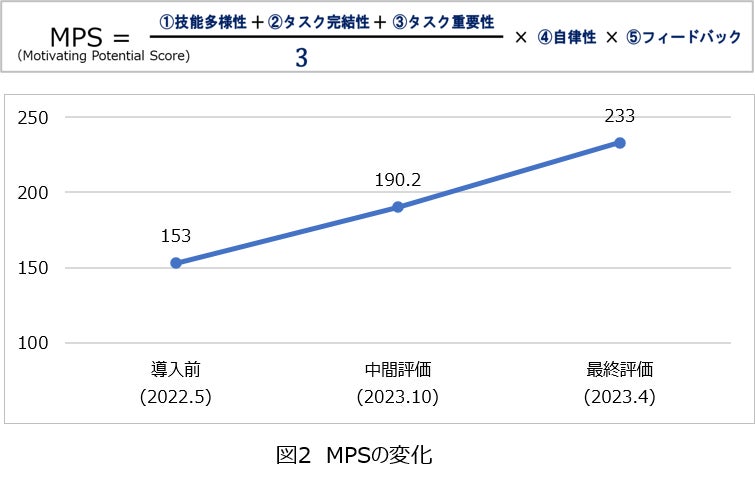 て評価した。図1にある通り、導入前と比較すると80ポイント向上した。特に自律性、フィードバックの向上を