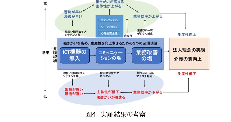 研究の結果、ICT見守り機器の導入は導入準備(リスキリングの機会)、データを活用するコミュニケーションの場づくり、業務改善の実施を条件に職員の働きがいや生産性向上に影響することが明らかになりました。