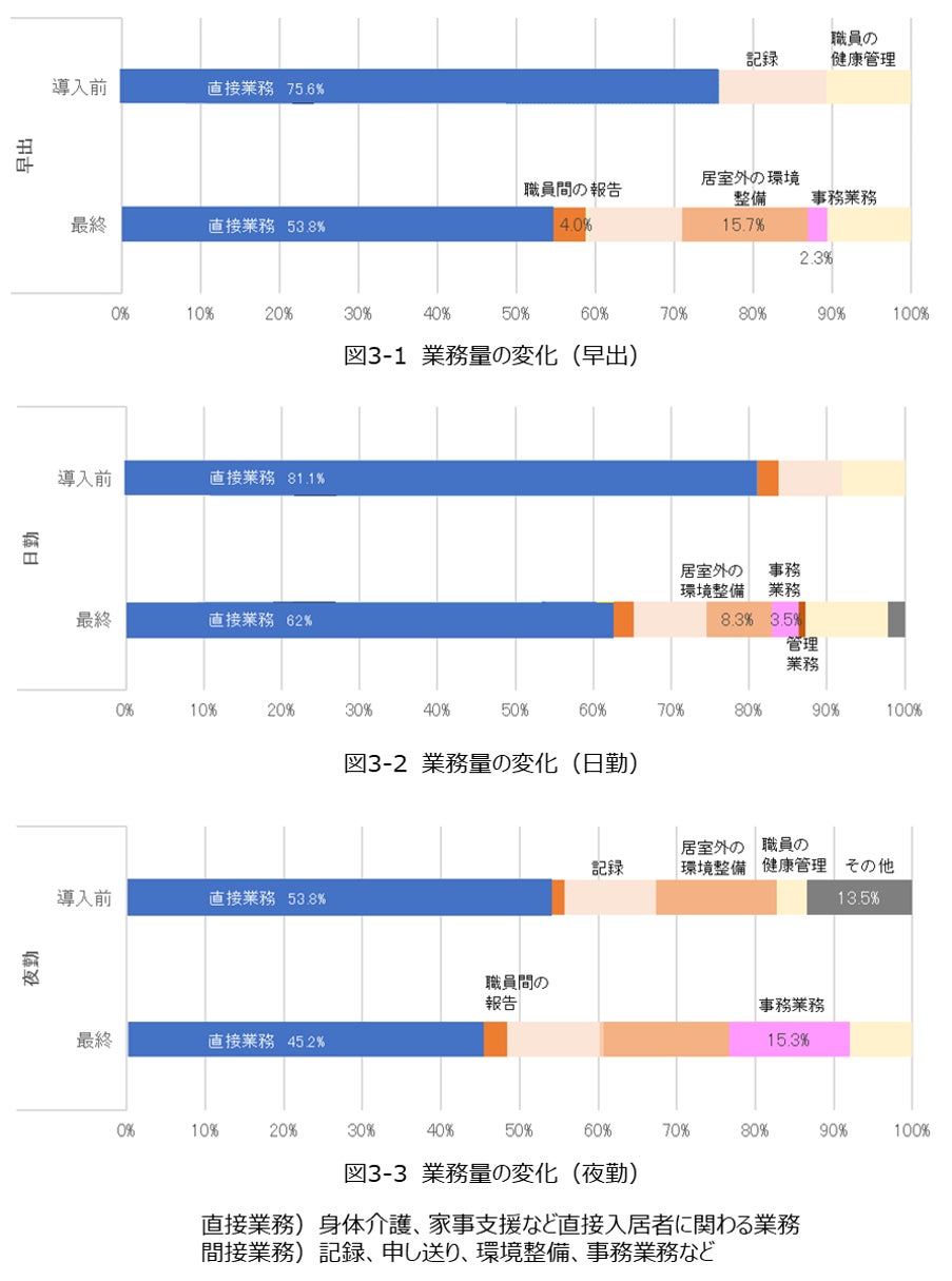 当初はICT見守り機器導入と業務整理により直接業務の増加を予測していたが、図2-1,2,3にあるように直接業