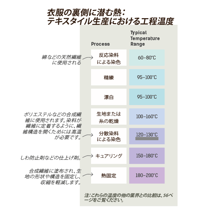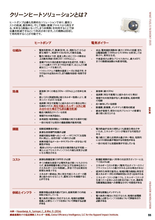 衣服の製造工程では、染色/漂白/乾燥/アイロンなどの工程で、膨大な熱エネルギーを必要とする。ファッションブランドにおけるScope 3排出の多くは熱エネルギーであるため、再エネ切り替えだけでは排出削減には不十分である。クリーンヒートの実践方法は、電化(電気ボイラーの使用)、ヒートポンプ(すでに工場内にある熱を集めて活用する)などが挙げられる。