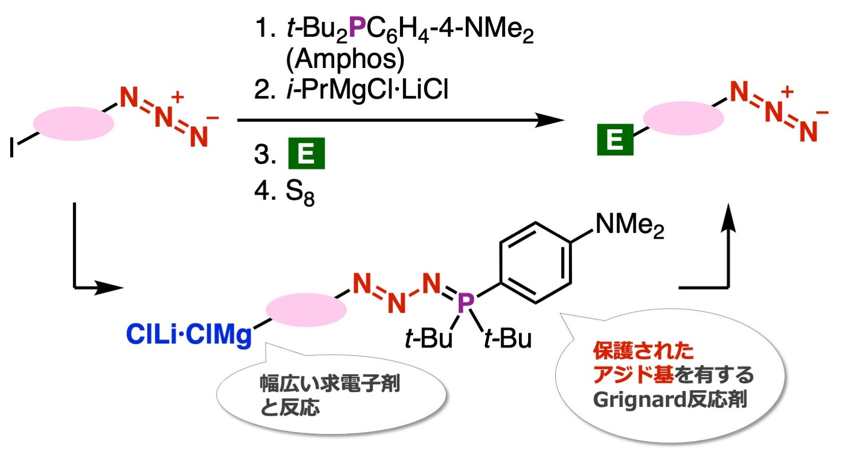 本研究グループは過去の研究で、有機リン化合物であるAmphosがアジド基とスムーズに反応してホスファジドを生成すること、また生成したホスファジドを硫黄で脱保護することで元のアジド基に変換できることを見出していました。これらの知見から、吉田准教授らは、ヨウ化アリールのアジド基をAmphosで保護した後、ターボGrignard試薬と反応させることで、保護されたアジド基を有するGrignard反応剤を得られるのではないかという考えに至りました。これにより、アジド部分の反応性を抑えた状態でのGrignard反応が可能となり、分子内に他の置換基を導入できると期待されます。今回、本研究グループは、Grignard反応によりヨウ化アリールのヨウ素部分にさまざまな置換基を導入し、多種多様なアジド化合物とそれを原料とした1,2,3-トリアゾールの合成を行いました。