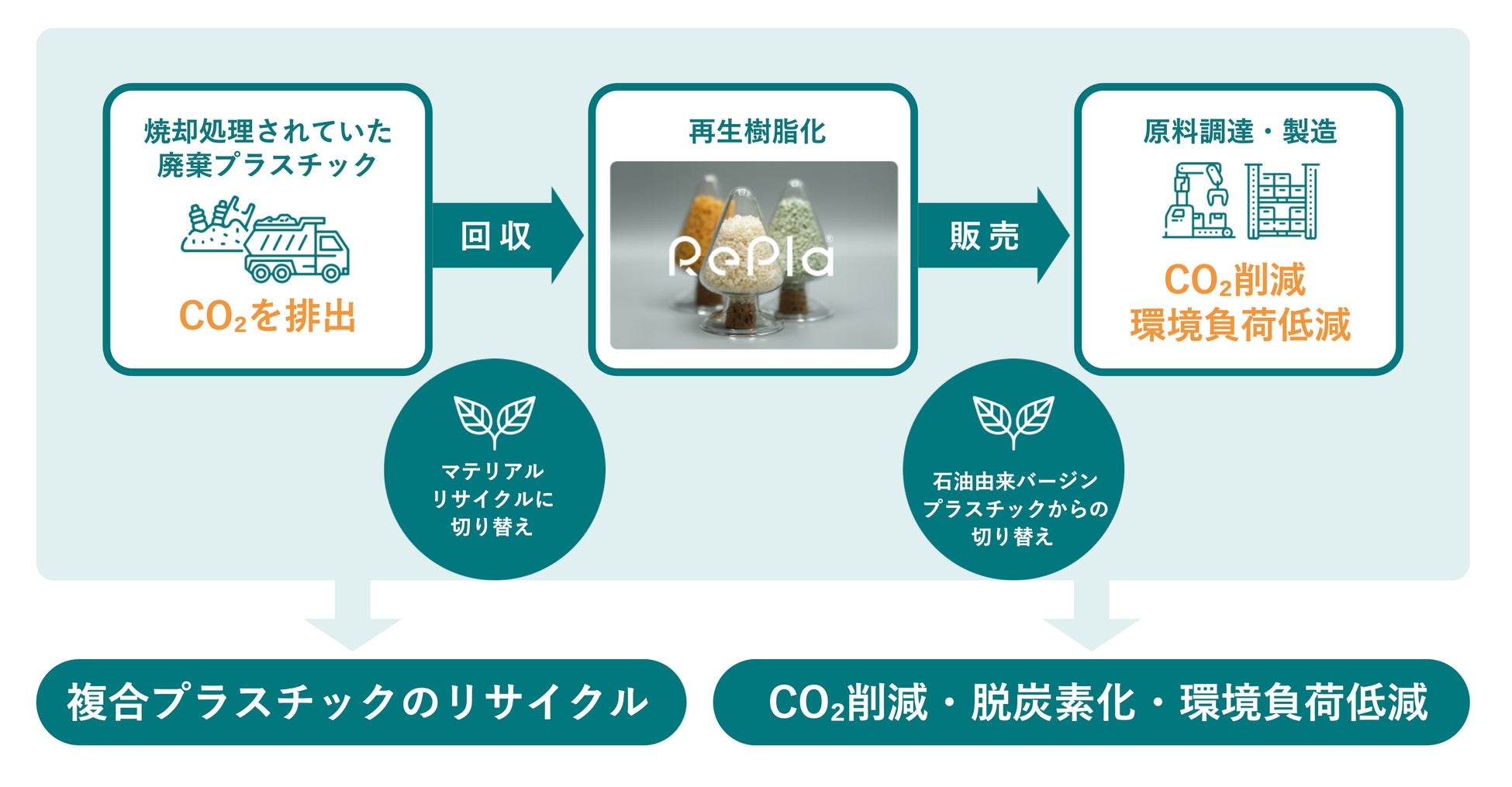 2023年には、産業廃棄物として出されるプラスチックを有効的に再利用することでプラスチックの循環型スキームを構築すべく、廃棄プラスチックの有価買取も開始。単一素材だけでなく複合素材のプラスチックも回収・ペレット処理を可能としました。回収したプラスチックは、「esa method」により、再生プラスチックペレット「Repla®」の原料として再利用します。再生プラスチックペレット「Repla®」を販売するECサイト「Replaペレットショップ」をオープンするなど、廃棄プラスチックの回収から再生プラスチックペレットとして原料化、Repla商品の販売・提供を通じ、プラスチックの循環型スキームを構築、サーキュラーエコノミーの実現に寄与しています。