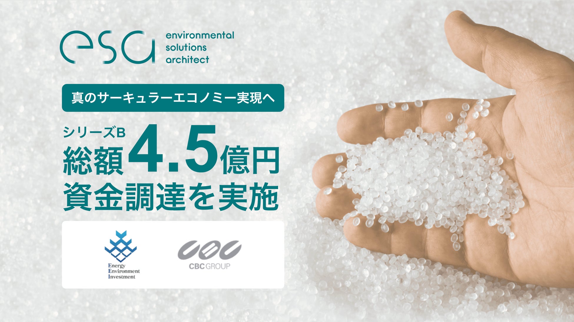 プラスチックのリサイクルを中心とした環境事業を展開する「株式会社esa(読み:イーサ、意味:Environmental Solutions Architect の頭文字)」(本社:東京都港区、代表取締役:黒川 周子、以下「当社」)は、株式会社環境エネルギー投資、CBC株式会社を引受先とした第三者割当増資を行い、シリーズBラウンドにて総額4.5億円の資金調達を実施したことをお知らせいたします。今回の資金調達により、当社の累計調達額は総額8.1億円に達しました。