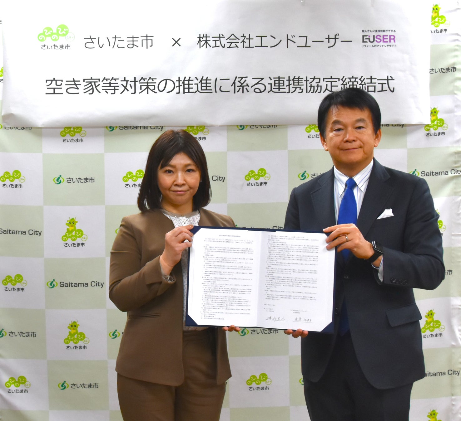 『職人に直接頼めるリフォームのマッチングサイトEUSER』を運営する株式会社エンドユーザー(本社:埼玉県熊谷市、代表取締役:渡邉 佳津子 以下当社)は、2025年1月29日(水)に、政令指定都市であるさいたま市と空き家問題解決に向けた「空き家等対策の推進に係る連携協定書(以下本協定)」を締結しました。