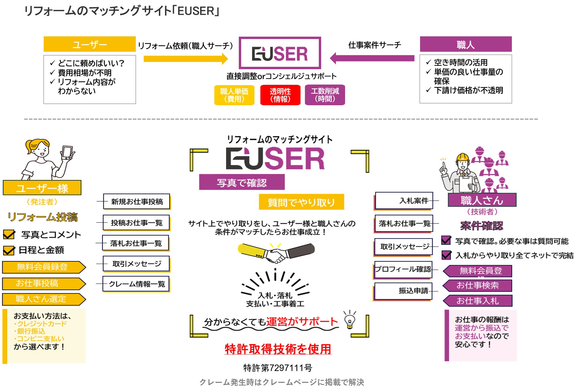 「EUSER」はリフォーム会社や管理会社を通さずに、リフォーム工事を直接職人に依頼できるプラットフォームで、特許技術(※)を取得した日本初の仕組みを導入しています。