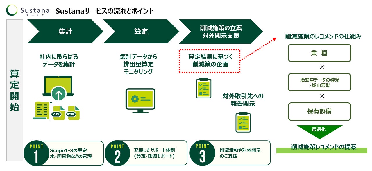 「Sustana」(サスタナ)の最大の特徴は、CO2排出量を算定・可視化するだけでなく、削減目標を立て施策を検討し、その実行までを一気通貫でサポートする点です。
