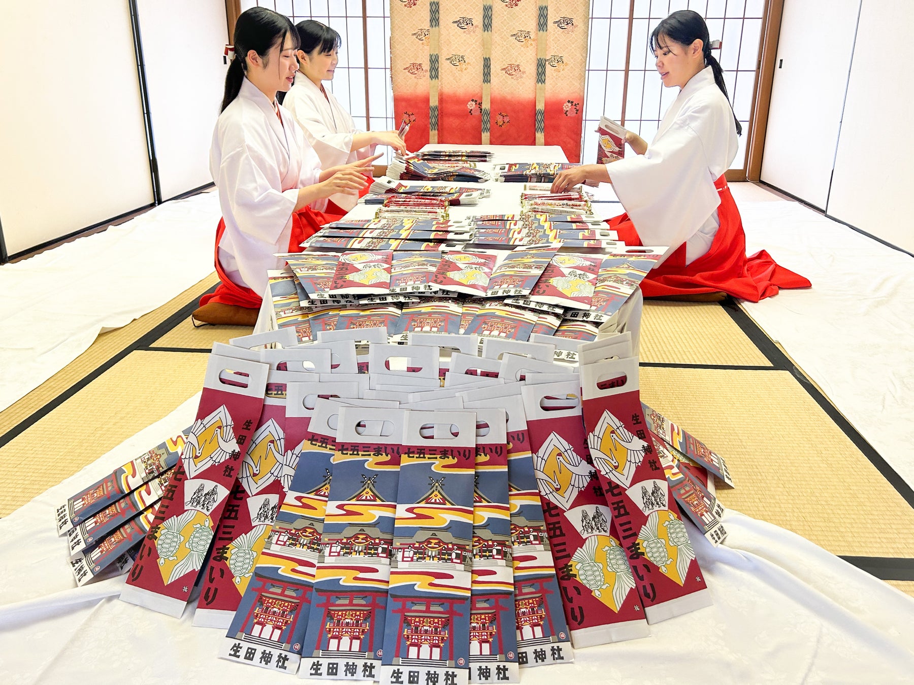 2.9月1日からの七五三詣に向けて、千歳飴の袋詰め作業に取り組む巫女。