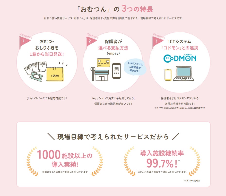 2019年11月にサービスを開始した「おむつん」は、保育施設で使用する紙おむつ・おしりふきが使い放題になるサブスクリプションサービスです。