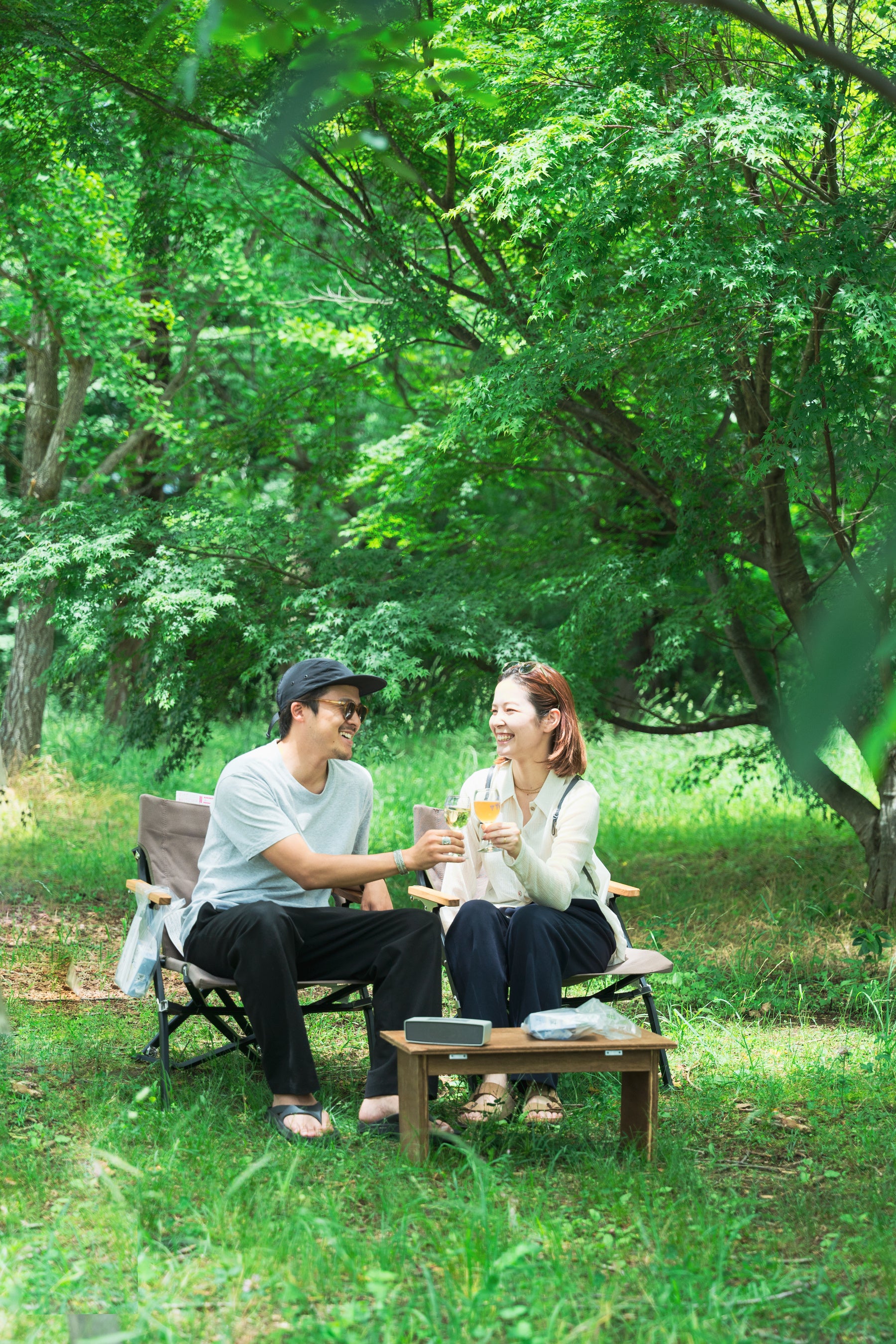 青空の下、グラスで少しずつ。またグループでボトルをシェアしながら、山梨のワインと食を楽しむ空間です。