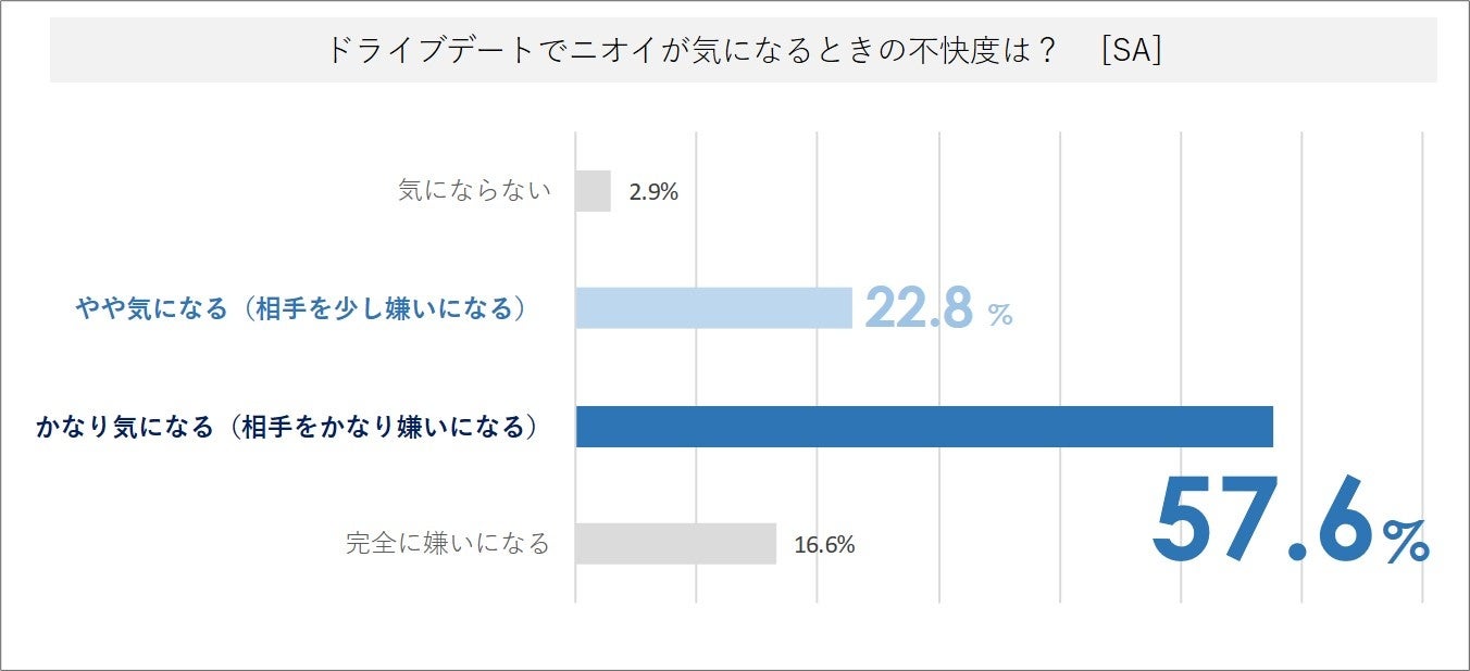 ドライブデートで車内のニオイが気になった時の不快度について、「かなり気になる」と答えた人が最も多く57.6%。「相手のことを完全に嫌いになる」と答えた人も16.6%おり、車内のニオイが関係悪化の原因になりうることが浮き彫りに。
