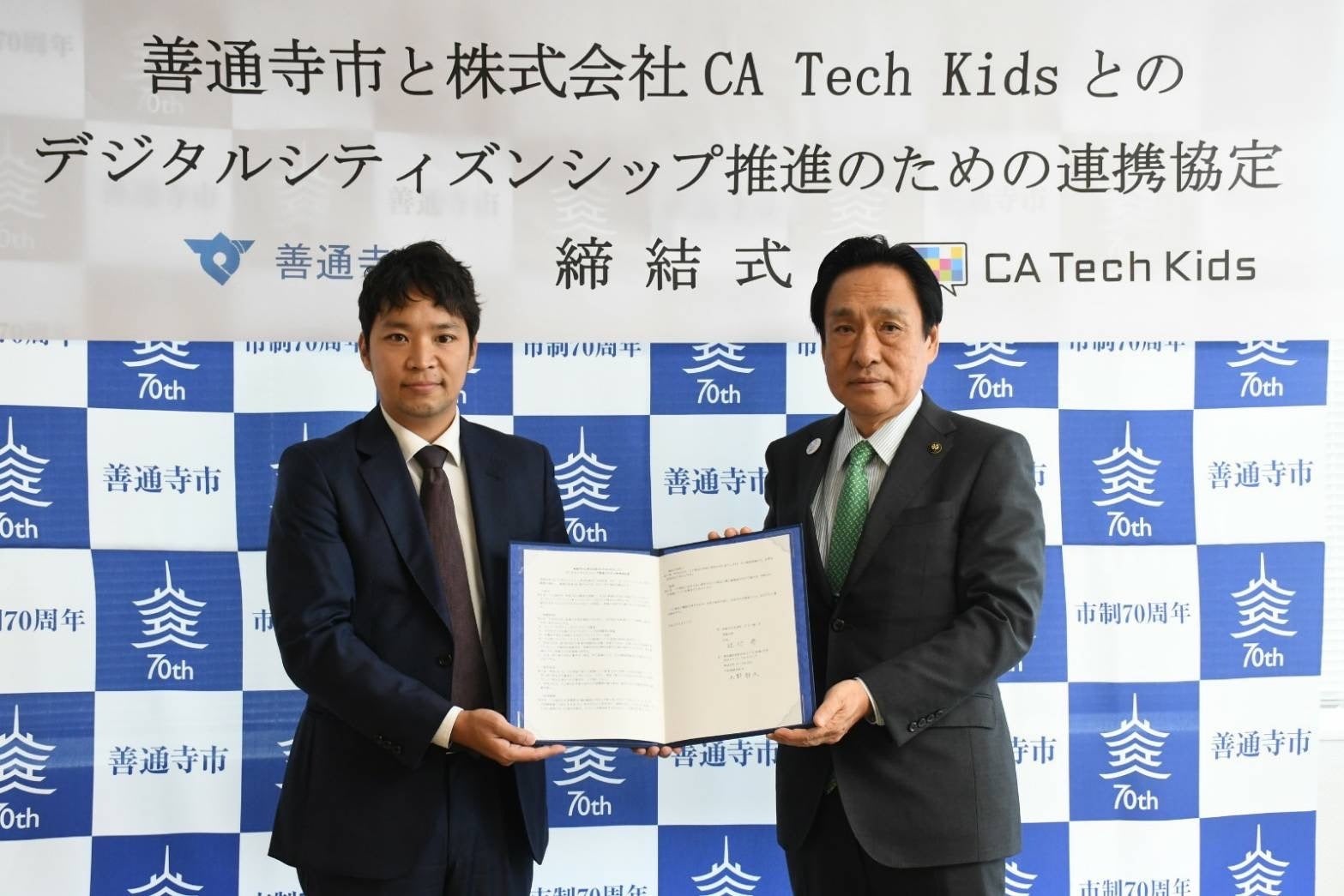 株式会社CA Tech Kidsとは令和元年度以降、小学校教員へのプログラミング教育研修や、市内小学校でのプログラミング授業、善通寺市キッズプログラミングコンテストの実施支援などを通じて、本市における、自立的で独創的なプログラミング教育環境の実現にご協力いただいております。両者の協力と連携を更に強化し、デジタルシティズンシップを推進するための連携協定が締結されましたことを大変心強く感じております。