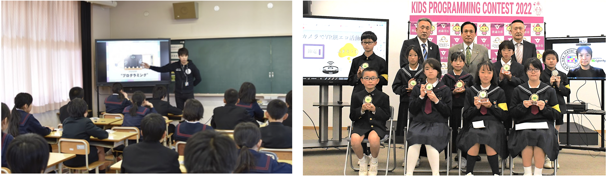 (写真左:2019年市内小学校での授業の様子、右:2022年善通寺市キッズプログラミングコンテスト表彰式)