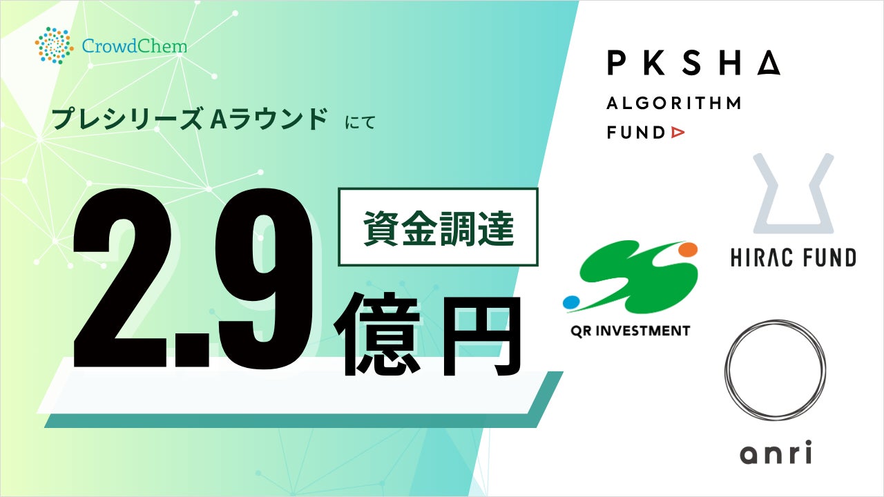 株式会社CrowdChem(クラウドケム)(本社:東京都品川区、代表:池端 久貴、以下CrowdChem)は、プレシリーズAラウンドにてPKSHAアルゴリズム2号投資事業有限責任組合をリード投資家に、新たにHIRAC FUND2号投資事業有限責任組合、ほくりくスタートアップコミュニティ投資事業有限責任組合、北陸地域ベンチャー投資事業有限責任組合、ANRI5号投資事業有限責任組合からエクイティによって2.9億円の資金調達を実施いたしました。