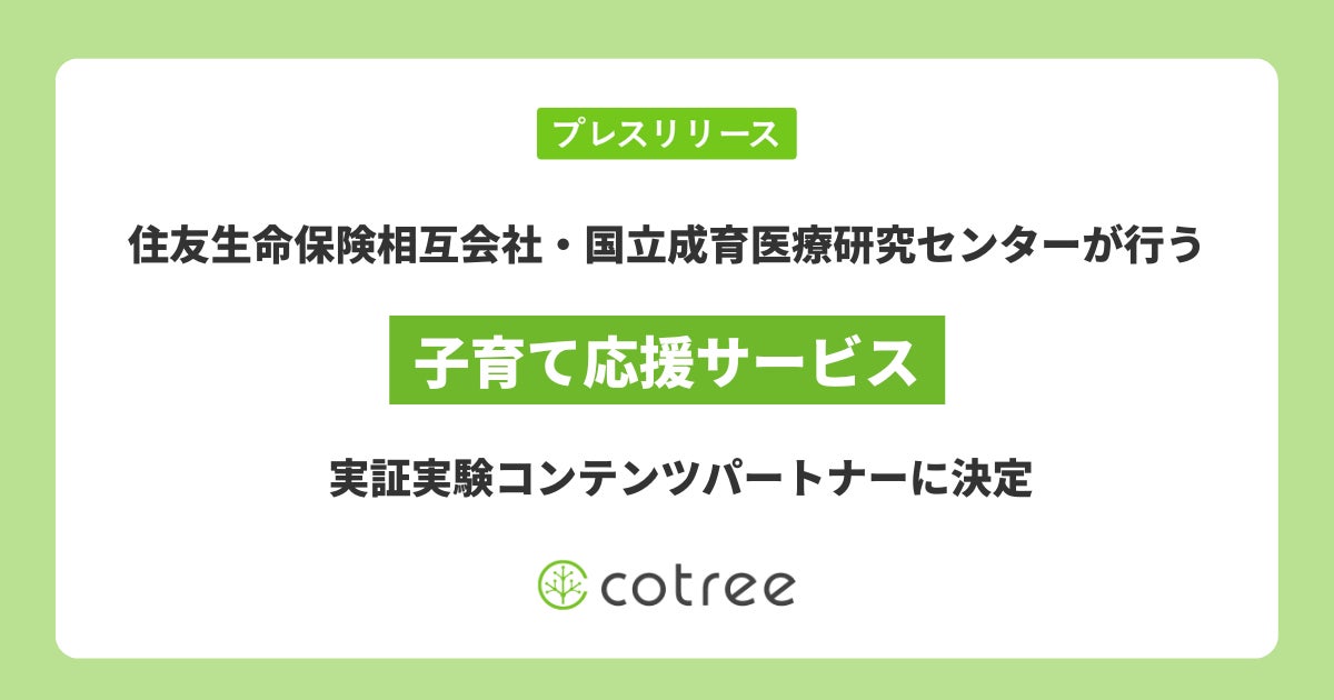オンラインカウンセリング事業を展開する株式会社cotree(本社:東京都港区、代表取締役:西岡 恵子、以下「cotree」)は、住友生命保険相互会社(本社:大阪府大阪市、取締役 代表執行役社長:高田 幸徳、以下「住友生命」)と国立研究開発法人国立成育医療研究センター(本社:東京都新宿区、理事長:五十嵐 隆、以下「国立成育医療研究センター」)による、家事育児で大変な毎日を明るく活き活きとしたものにすることを目的とした、「子育て応援サービス」の実装に向けた実証実験に、コンテンツパートナーとして参画します。
