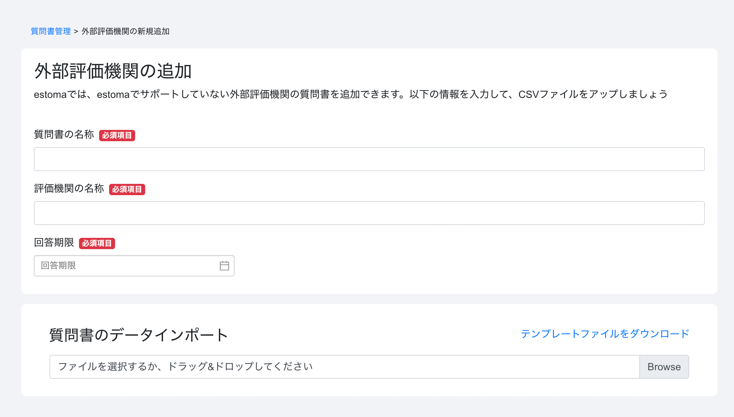外部評価機関から回答を要求される質問事項は、量もさることながら基準が曖昧なものが多く、回答が困難なケースがあります。さらに、多くの質問書が英語で構成されている点も、回答の心理的なハードルとなっています。estomaでは、質問を日本語に翻訳され、かつ、全ての質問にガイダンスや回答の要点がまとまっているため、効率的な回答作業を実現します。