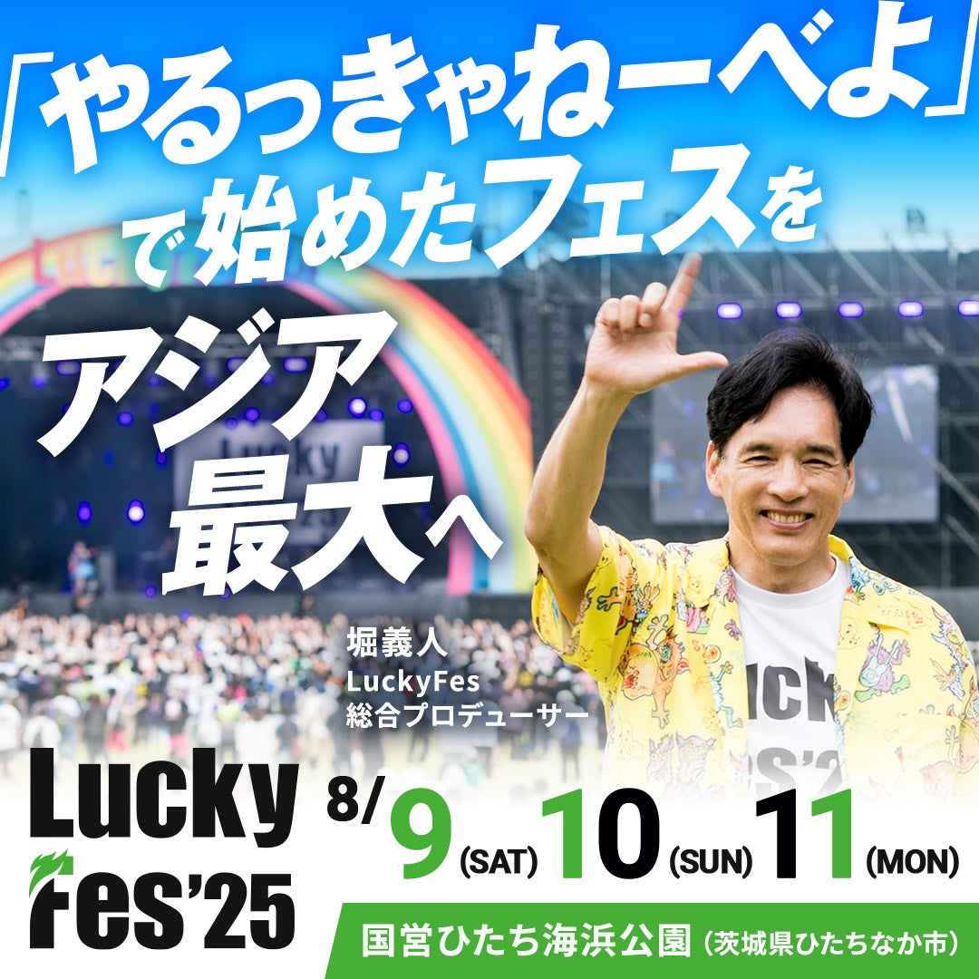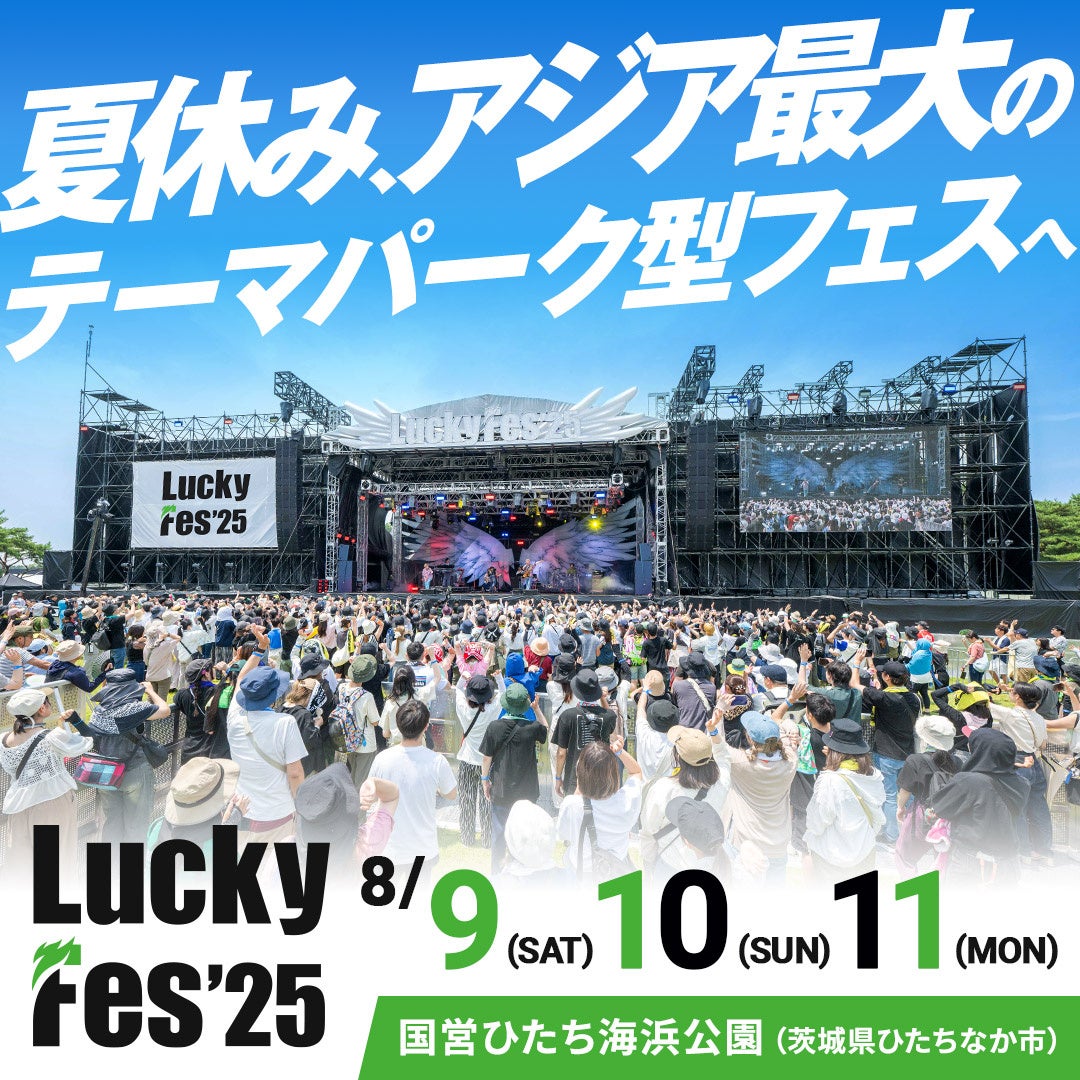 LuckyFesは「夏休み、アジア最大のテーマパーク型フェスへ」を合言葉に、茨城県ひたちなか市の国営ひたち海浜公園で開催している音楽フェスになります。LuckyFes’25は4ステージで108組のアーティストが出演し、テーマパーク型の音楽フェスティバルへと進化しています。