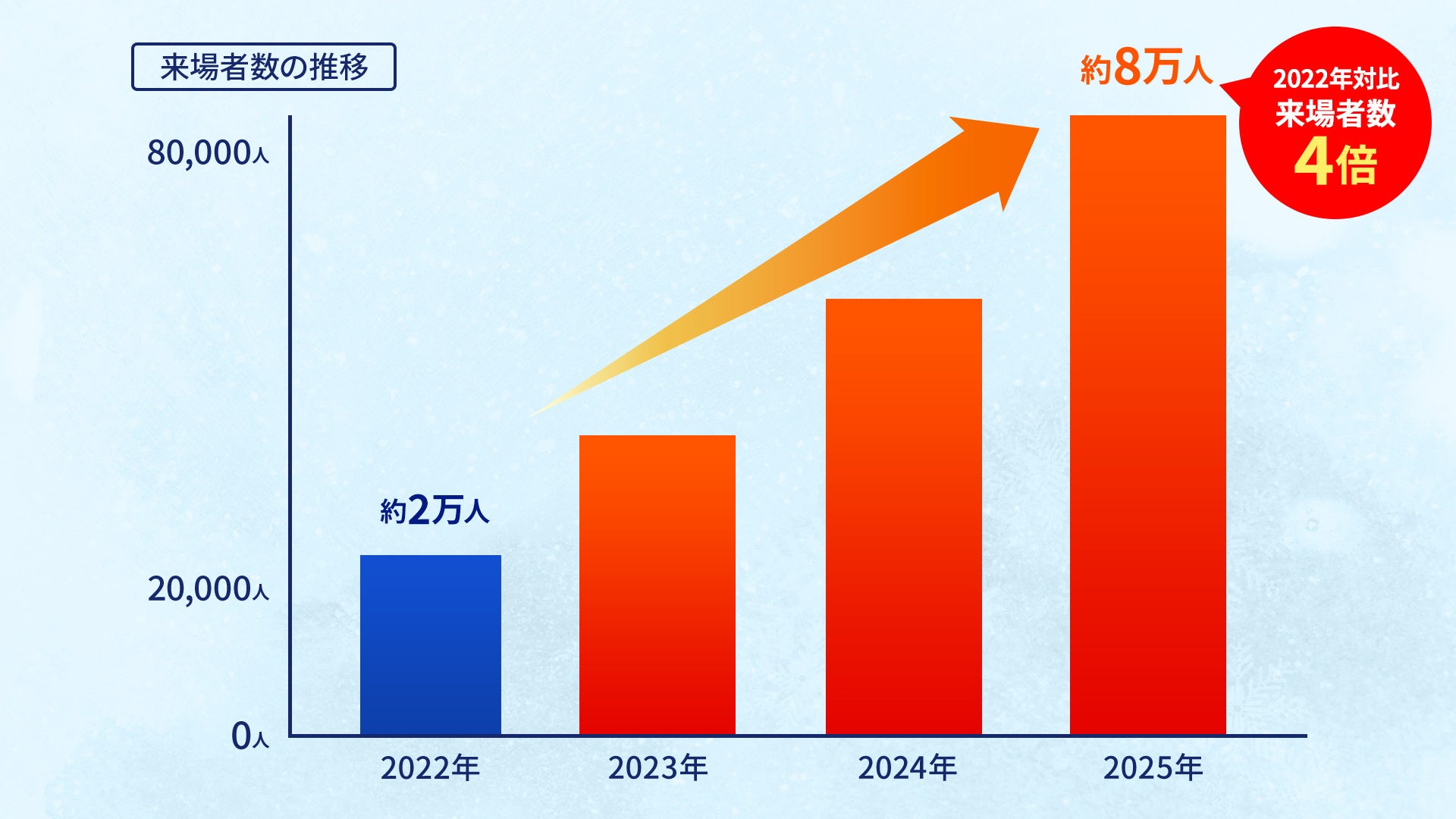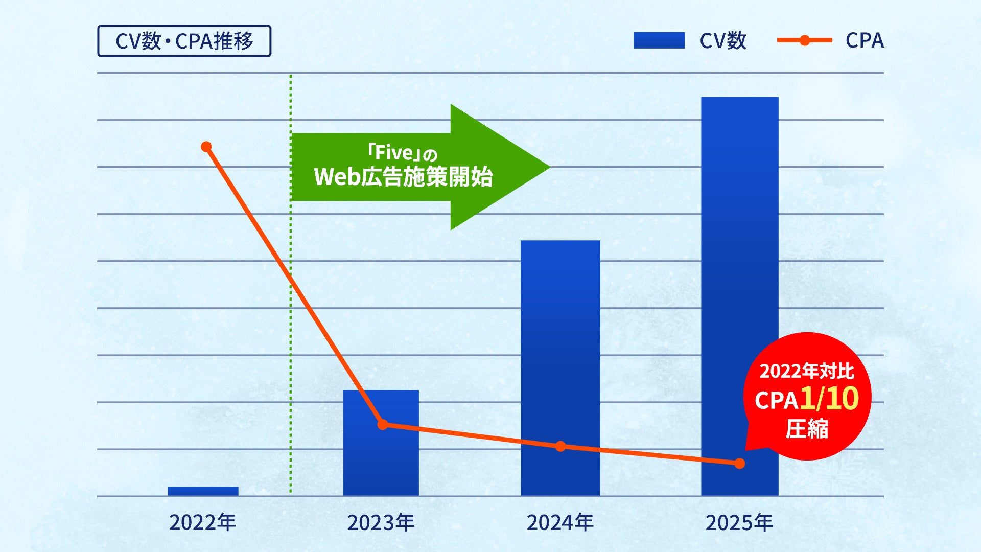 2023年からFiveにてWeb広告運用を実施してから、Web広告を含めた各種施策の相乗効果により、来場者数は年々上昇傾向となっております。加えて、広告効果は毎年改善し続けており、PDCAサイクルを徹底的に回し、初年度と比較して『CPA 1/10まで圧縮』の実現ができております。