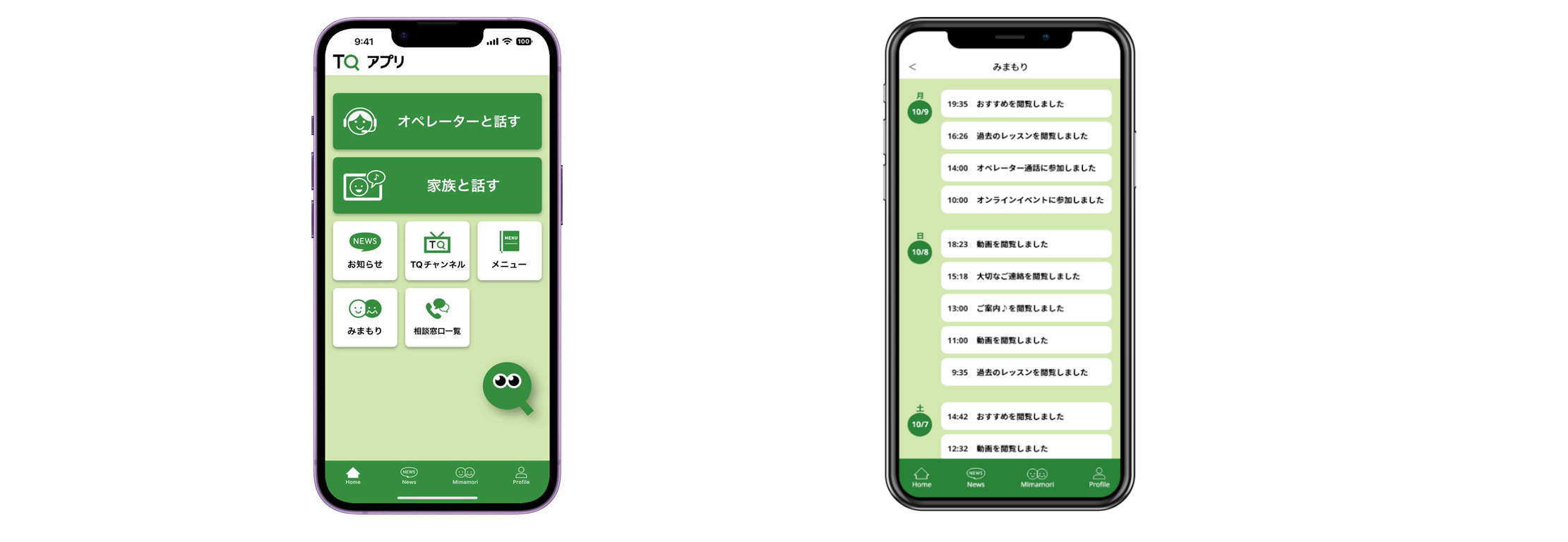TQアプリではTQタブレットの利用履歴が確認できるので、利用状況を定期的に確認し見守ることができます。またオペレーターとの会話やTQコネクトが企画するオンラインイベントにも親子で簡単に参加が可能です。