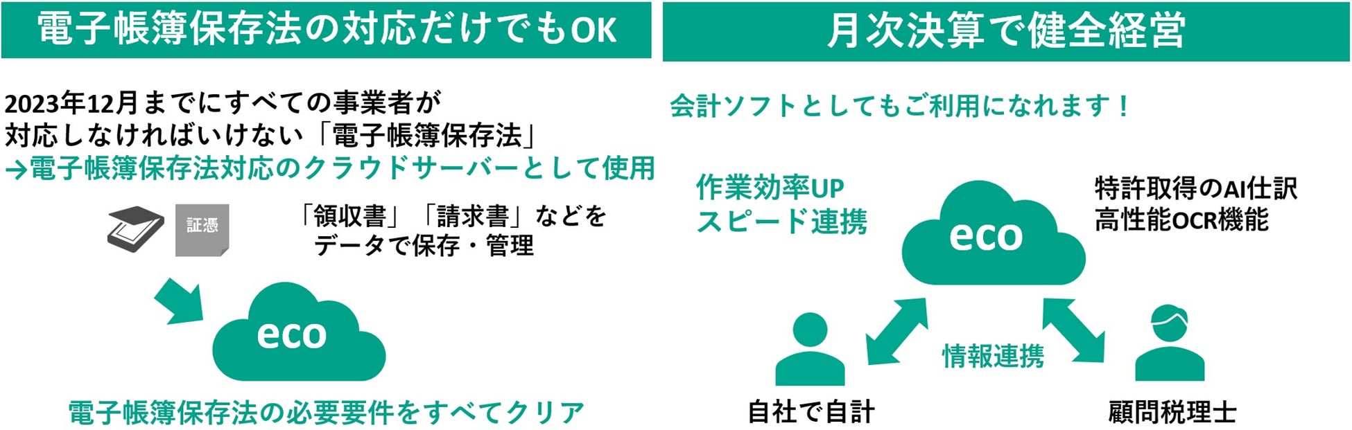 今回のフォーバルとの取り組みは「中小企業のDX化を支援する」ことが目的となります。電子帳簿保存法にも対応しているeco会計クラウドは、その手法の一つとしてフォーバルの掲げる中小企業の伴走型支援を実現させていきます。