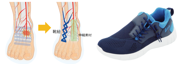 足の甲の重要な血管を避け、靴紐の位置を斜めに設置しました。靴紐は3種類の太さと形状を組み合わせた構造で出来ており、伸縮性と復元性に優れた結ぶ必要がない機能を搭載しています。さらに複数の素材が足を締め付けず保護します。踵は硬い芯材を使っていないため圧迫感がなく靴擦れしにくいのに踵が浮かない構造になっています。
