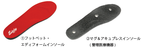 ①、②の2種類のインソールをご用意しました。普段は足裏の形状に沿って足を優しく包み込む①のインソールをご使用ください。疲れを感じたり、足がむくんだときは、管理医療機器の磁気パワーと適度な刺激の凹凸が疲労を緩和し血行を促進する②のインソールに替えてお履きください。