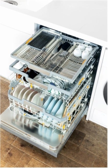 ・機械力:食器洗い機が持つ、汚れをはがす力(スプレーアーム)は洗浄力に大きく影響します。Mieleは3段のスプレーアームで水圧と回転速度によって、最少の水量で隅々まで強力な洗浄力を発揮します。