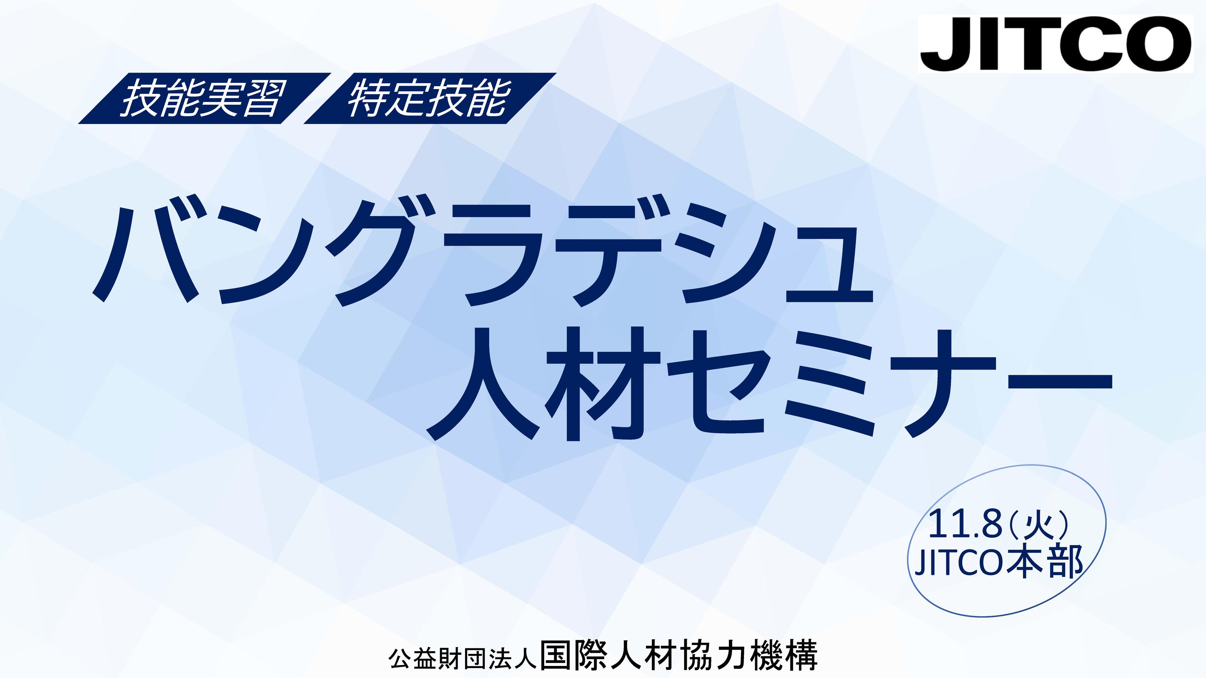 公益財団法⼈国際⼈材協⼒機構(JITCO・ジツコ、所在地:東京都港区、理事⻑:⼋⽊ 宏幸)は、駐日バングラデシュ人民共和国大使館と共同で、バングラデシュ海外居住者福利厚生・海外雇用省副大臣をお招きした「バングラデシュ人材セミナー」を開催いたします。バングラデシュは1.6億人以上の人口を有し、経済成長も著しく若手の人材も豊かな国です。