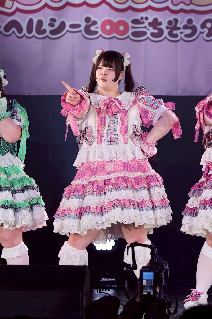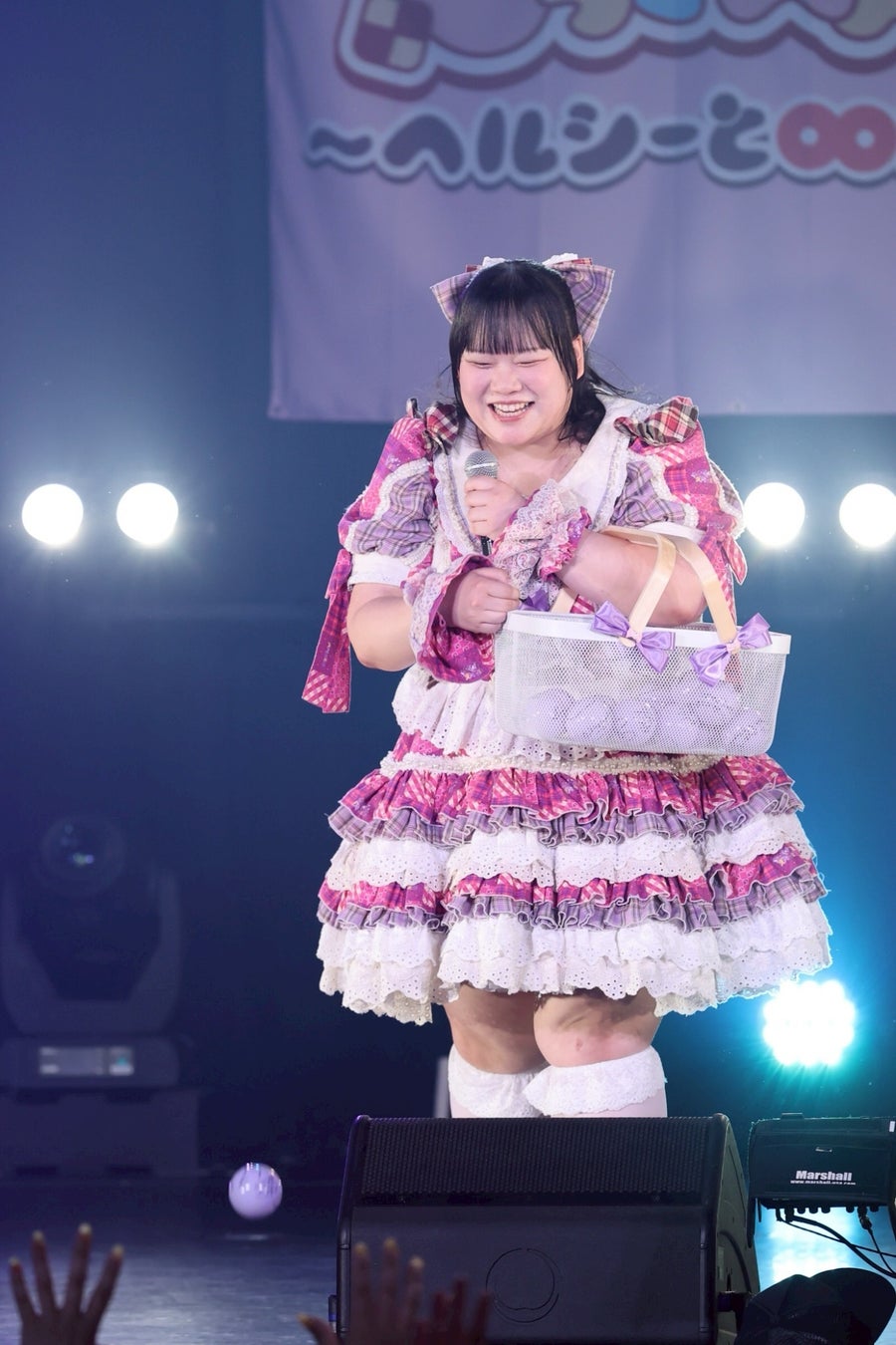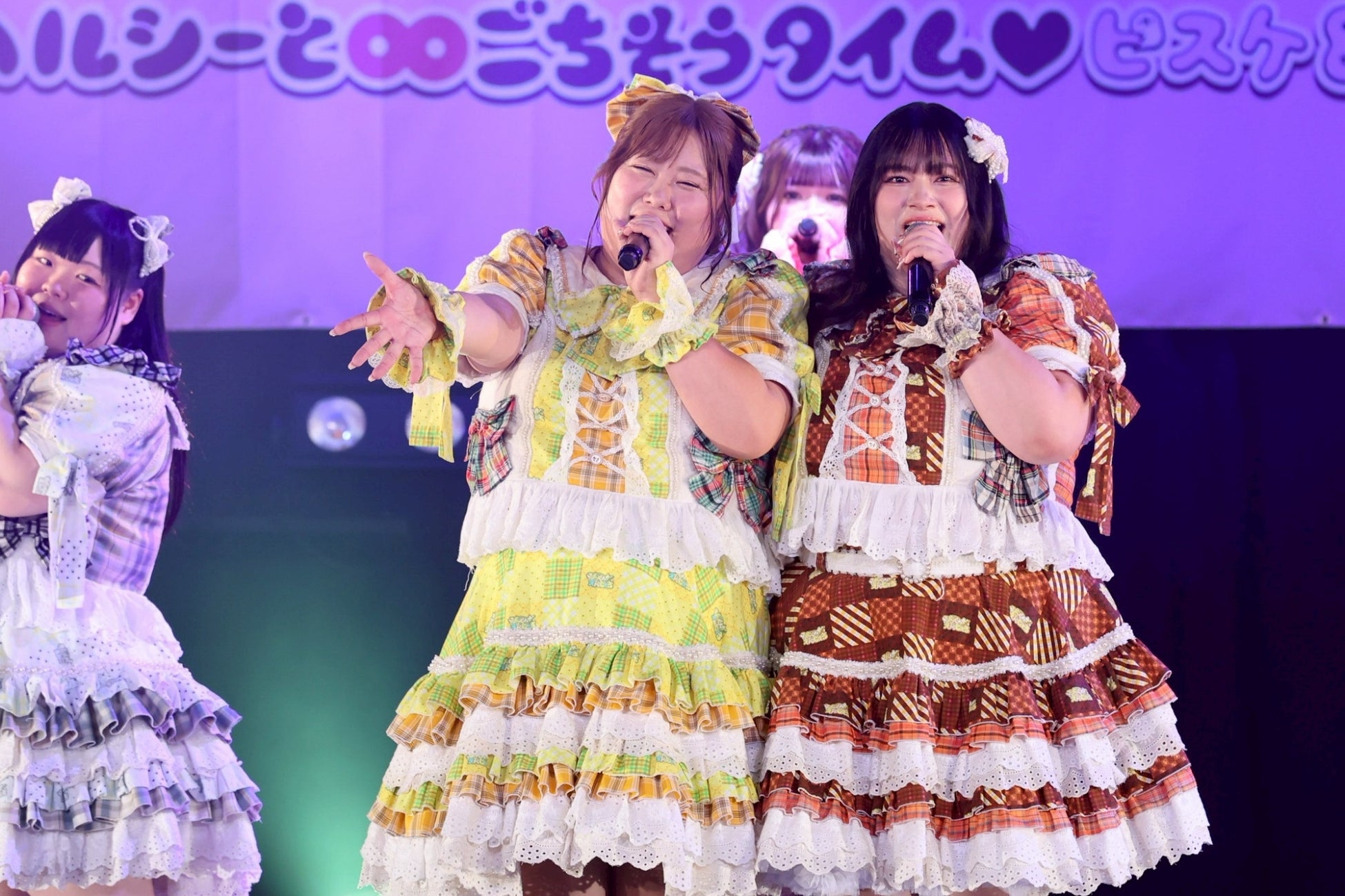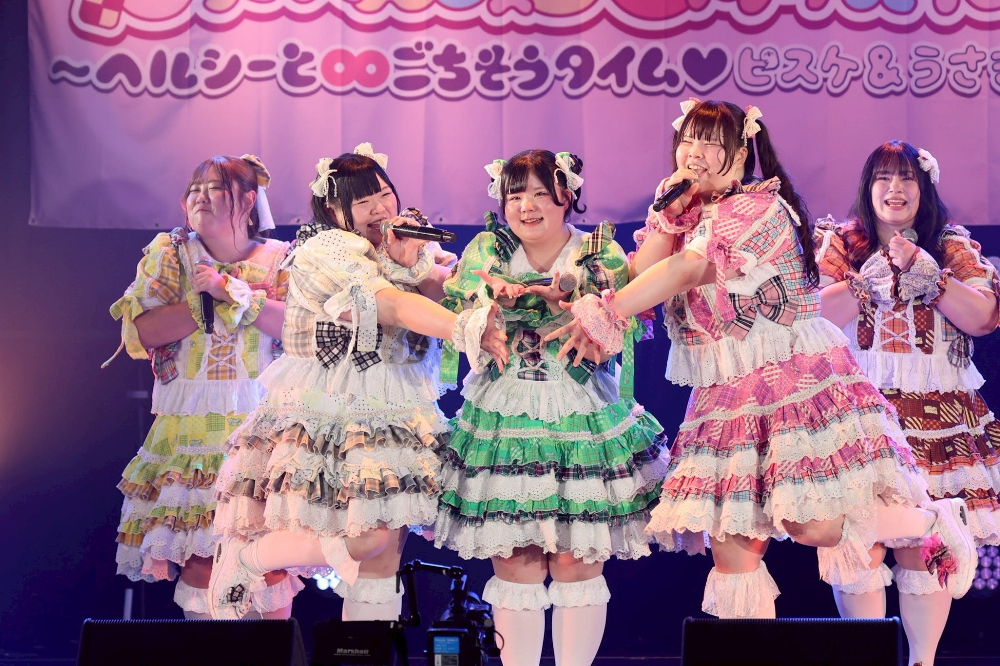 1曲目を終えたところで、初期メンバーの大橋ミチ子がいったんステージを降り、前半戦は6人でライブを展開。しかしながら、そのパフォーマンスは実に見応えのあるもので、デビューライブでも披露したという「BBG」ではしなやかな動きと弾ける笑顔でヘルシーを魅了。「生憎!いい肉!ミートデイ♡」では森川と笑原はなが寸劇のようなやり取りを繰り広げ、「WASSHOI~デブの最強肉祭り」では大きな動きでダイナミックなダンスを披露。といった具合に曲ごとに異なる魅力を示して、ヘルシーの視線を奪っていった。