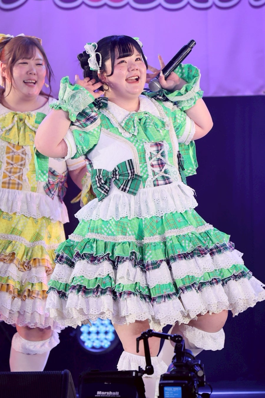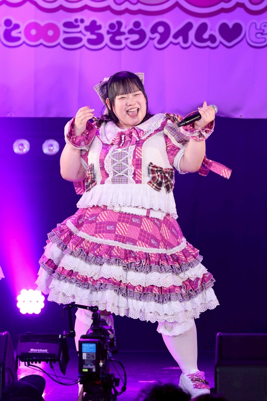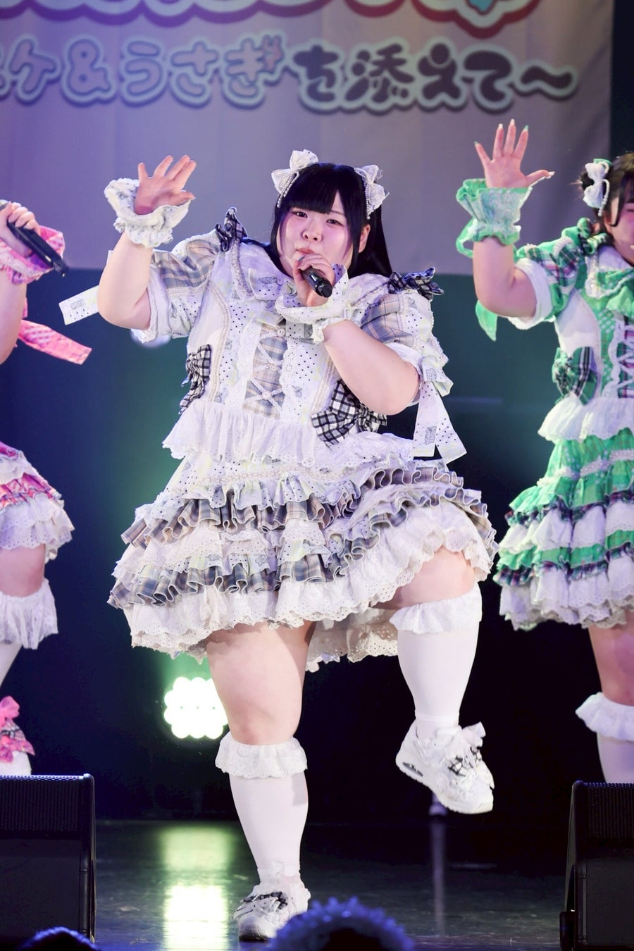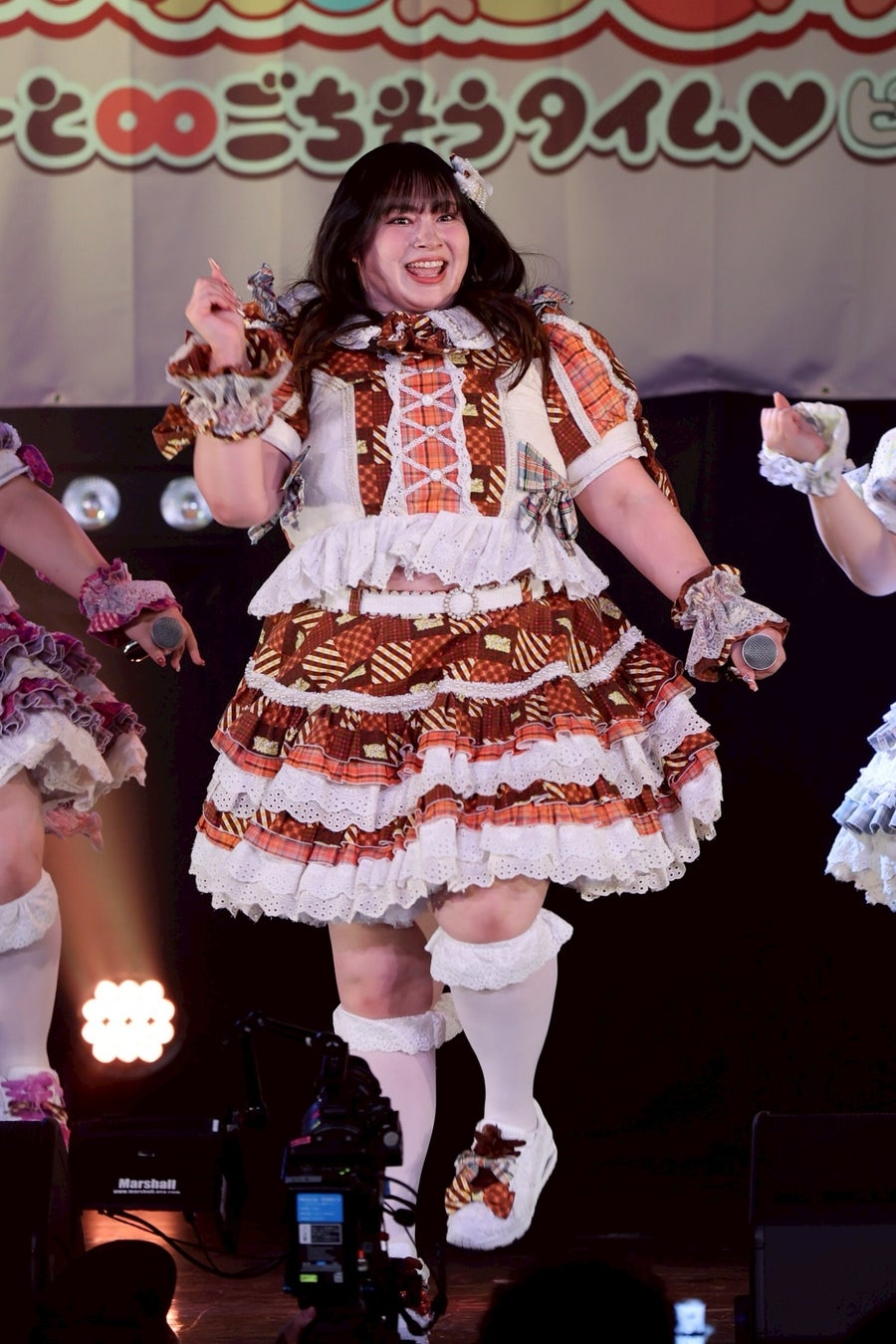 1曲目を終えたところで、初期メンバーの大橋ミチ子がいったんステージを降り、前半戦は6人でライブを展開。しかしながら、そのパフォーマンスは実に見応えのあるもので、デビューライブでも披露したという「BBG」ではしなやかな動きと弾ける笑顔でヘルシーを魅了。「生憎!いい肉!ミートデイ♡」では森川と笑原はなが寸劇のようなやり取りを繰り広げ、「WASSHOI~デブの最強肉祭り」では大きな動きでダイナミックなダンスを披露。といった具合に曲ごとに異なる魅力を示して、ヘルシーの視線を奪っていった。