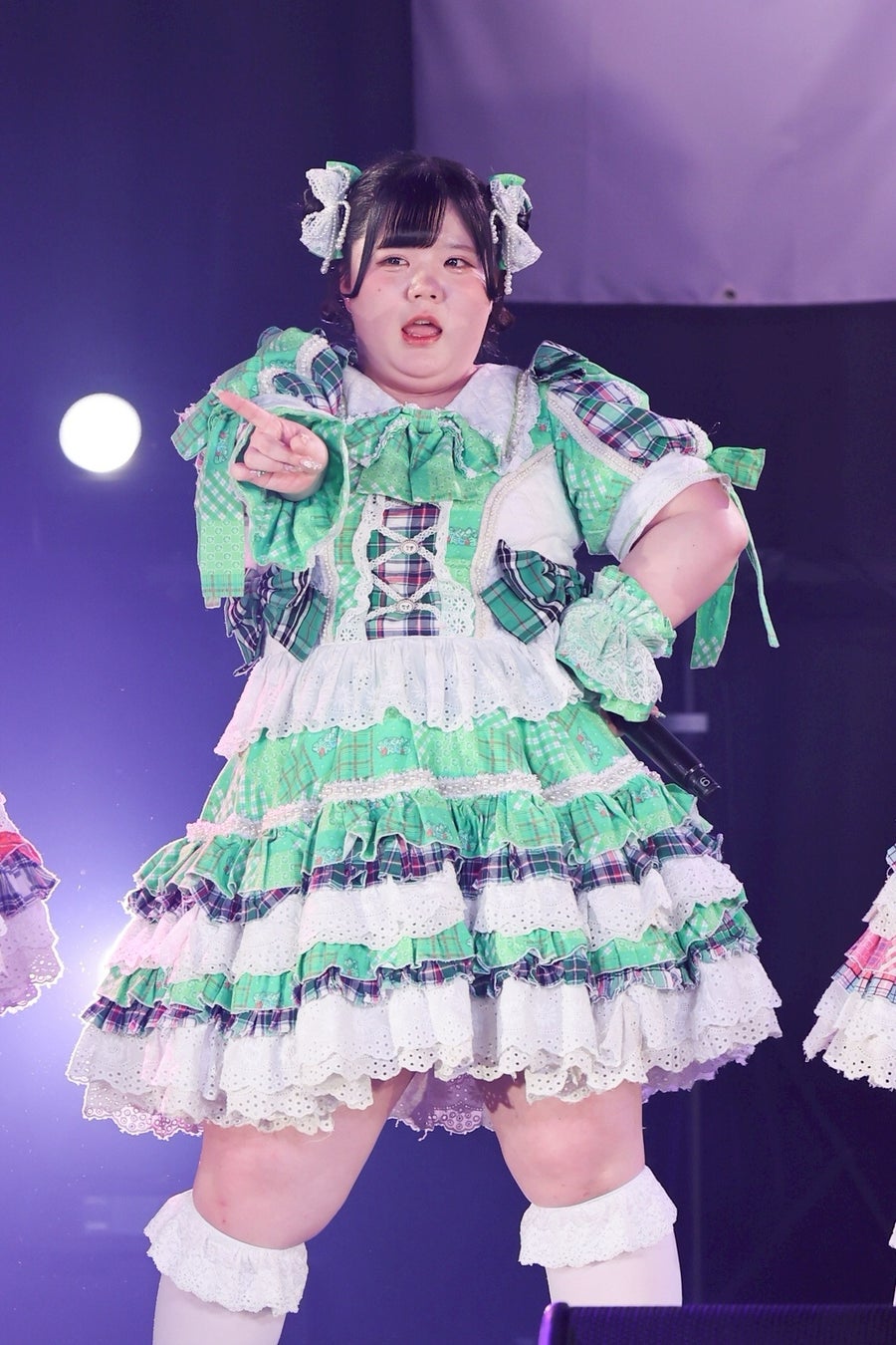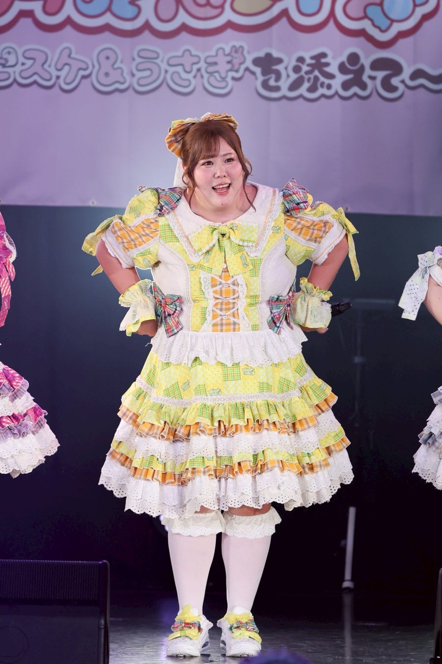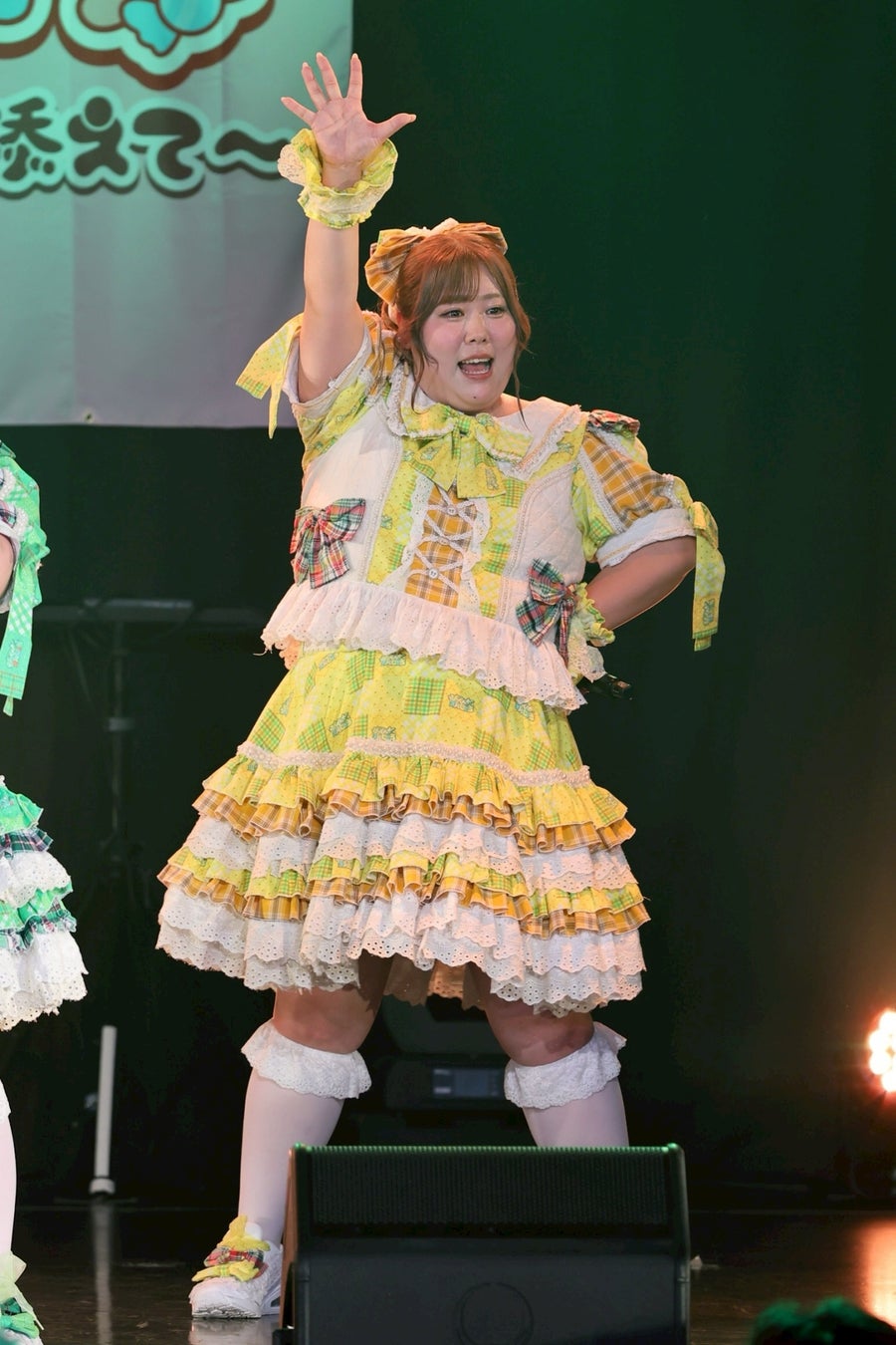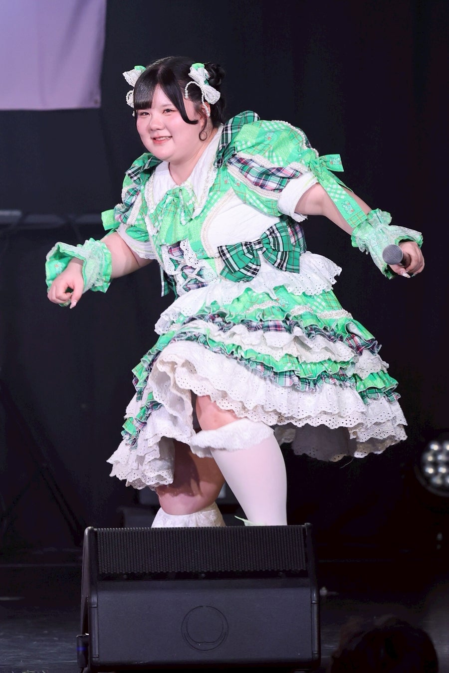 1曲目を終えたところで、初期メンバーの大橋ミチ子がいったんステージを降り、前半戦は6人でライブを展開。しかしながら、そのパフォーマンスは実に見応えのあるもので、デビューライブでも披露したという「BBG」ではしなやかな動きと弾ける笑顔でヘルシーを魅了。「生憎!いい肉!ミートデイ♡」では森川と笑原はなが寸劇のようなやり取りを繰り広げ、「WASSHOI~デブの最強肉祭り」では大きな動きでダイナミックなダンスを披露。といった具合に曲ごとに異なる魅力を示して、ヘルシーの視線を奪っていった。