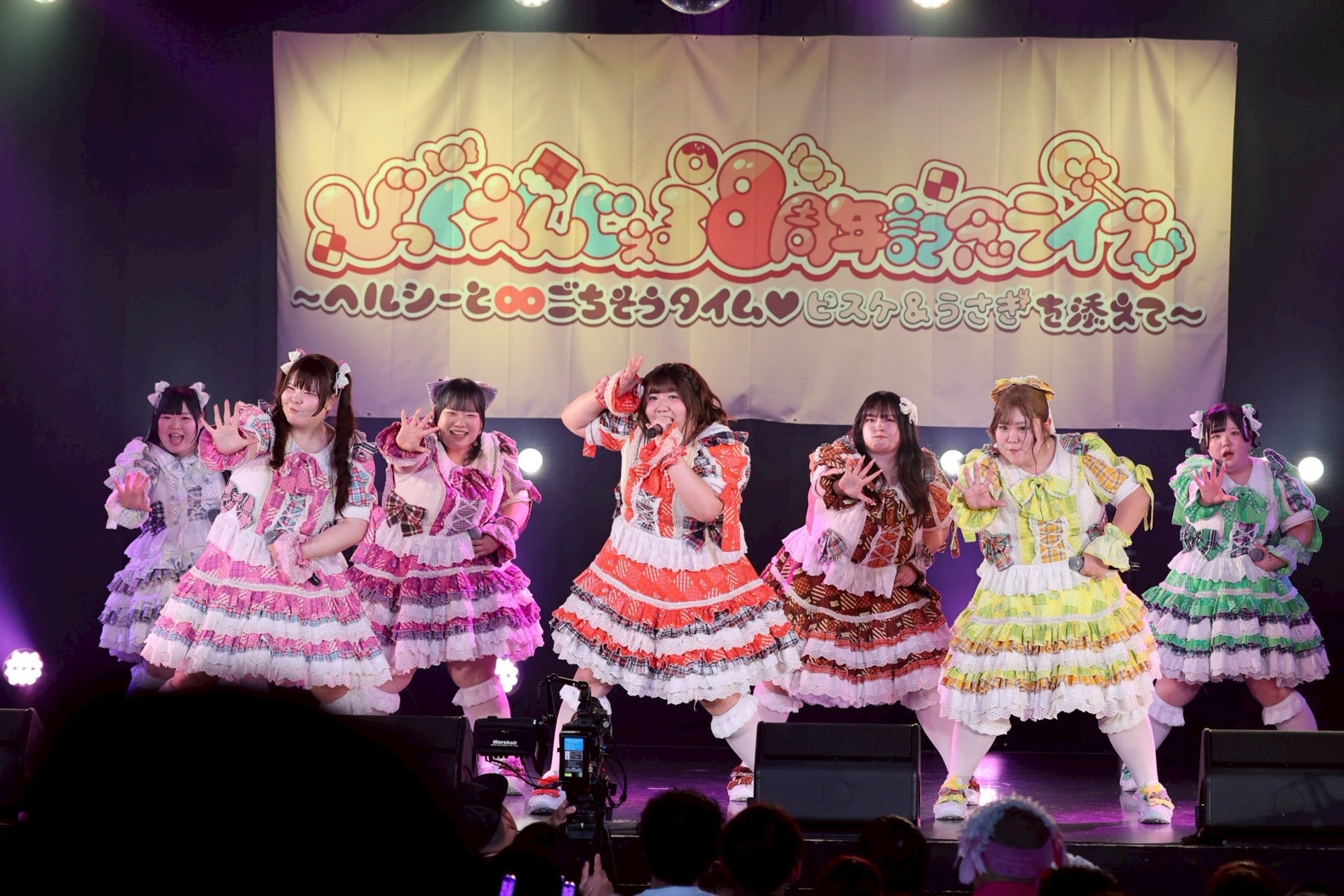 湧き上がる「おかわり!」の声でステージに呼び戻された7人は、「肥満戦隊デブレンジャー!」でカラーボールを投げながら歌い踊る。だがしかし、みんなボールを投げるのに必死でパフォーマンスがたどたどしくなってしまう。そんな姿に会場は何とも和やかな雰囲気となった。「びっくえんじぇるのこと、大好き?」の呼びかけにヘルシーが「大好き!」と返すとこの日2度目の「ダイエット始めなきゃ」へ。これまで以上に激しいパフォーマンスに煽られて、ヘルシーのコールが一段と大きく響き渡る中、マイクを外して7人が「ごちそうさまでした」の声を上げると、8周年記念ライブは大団円となった。