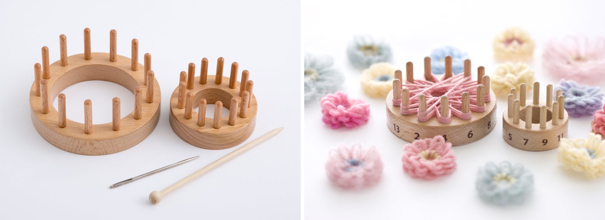 セット内容:フラワーリリヤンボビン(⽊製) ⼤・⼩各1個、リリヤン⽤針(⽊製)1本、⽑⽷⽤とじ針