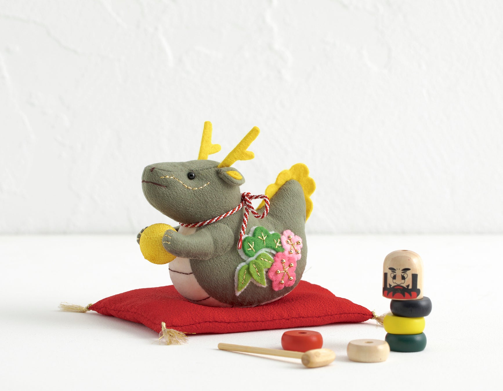 丸みのあるフォルムが可愛い辰のお飾りは、両手で抱える玉や専用の座布団もハンドメイドで楽しめます。玄関やリビングに飾ったり、大切な人へのプレゼントにも最適です。