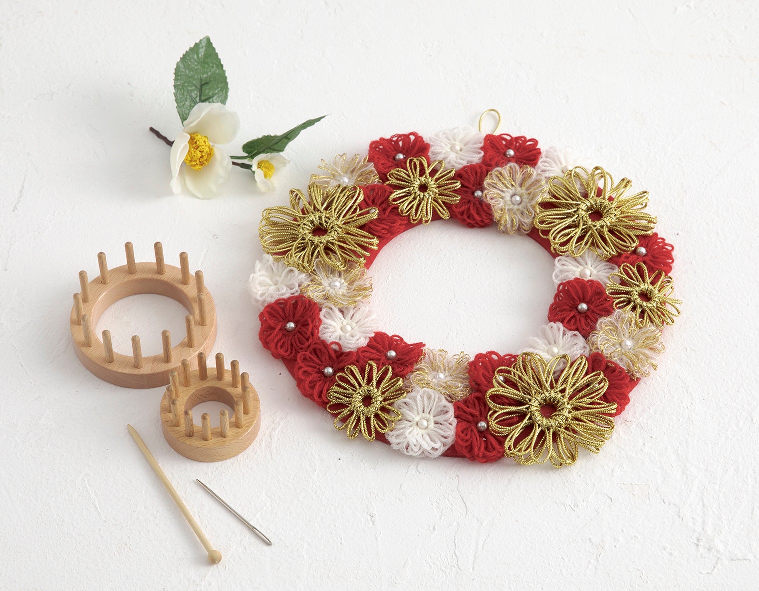 お正月のドア飾りにもおすすめの華やかでおめでたいリース。周囲のピンにかけていくだけで、簡単にかわいいお花のモチーフがつくれるフラワーリリヤンボビンを使用します。