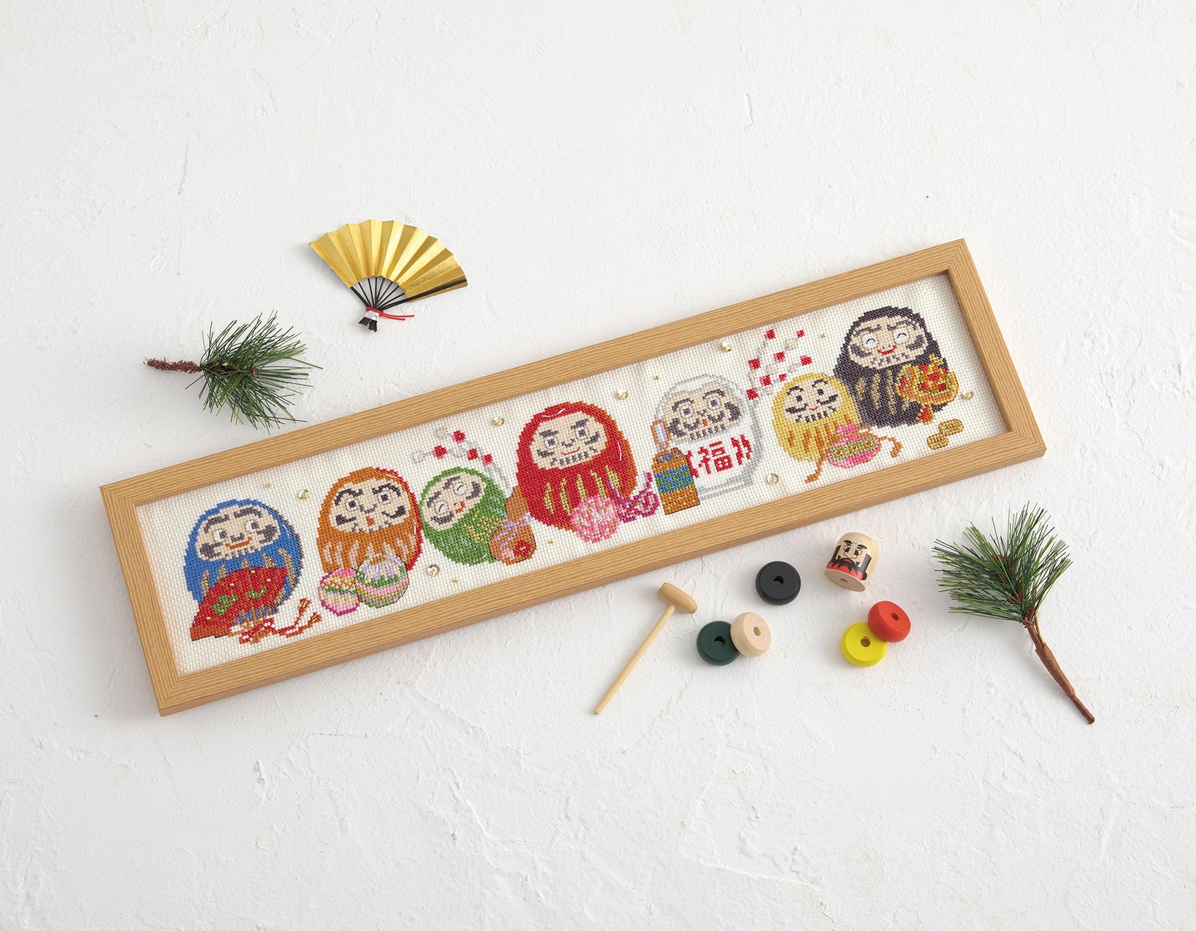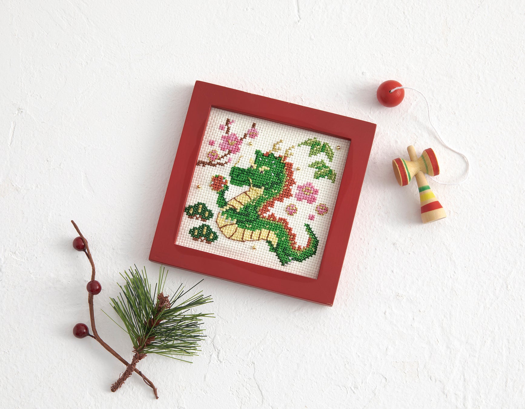 縁起物を組み合わせた楽しいデザインをやわらかい色合いで表現した刺しゅうキットや、勇ましくもかわいらしい2024年の干支『辰』がモチーフのキットなど、全7種類を発売します。