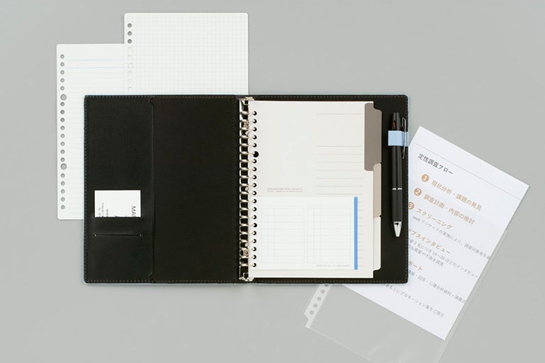 用途に合わせて選べる2種類のルーズリーフ、商談の場で必要な名刺ポケットとペンホルダー、半分に折ったA4サイズの書類が入るクリアポケット、書いたメモを案件ごとに整理できるインデックス。他にも、タスクを管理できるルーズリーフミニTODOリスト罫が付属。しっかりと綴じられる丈夫なメタル製のとじ具を採用しました。
