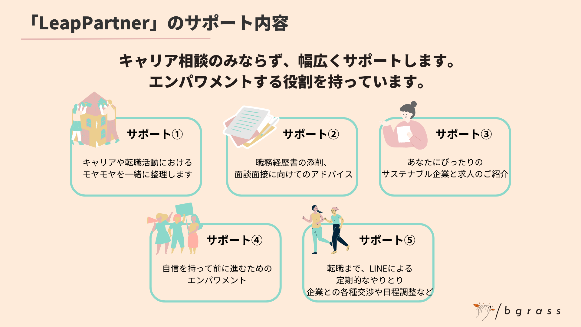 「Waveleap」は、女性ITエンジニアが自ら掲載企業へ応募することもできますが、転職キャリアサポート「LeapPartner」とともに転職活動を進めることも可能です。エンジニア転職やIT業界でのキャリア相談はもちろん、サステナブル企業と求人のご紹介、職務経歴書の添削や面接のアドバイス、日程調整や企業との各種交渉など、サステナブル企業への転職が実現するまでを全面的にサポートいたします。また、情報収集や転職活動におけるモヤモヤの整理など、転職活動におけるあらゆる不安や葛藤にも寄り添い、自信を持って前に進めるようエンパワメントいたします。