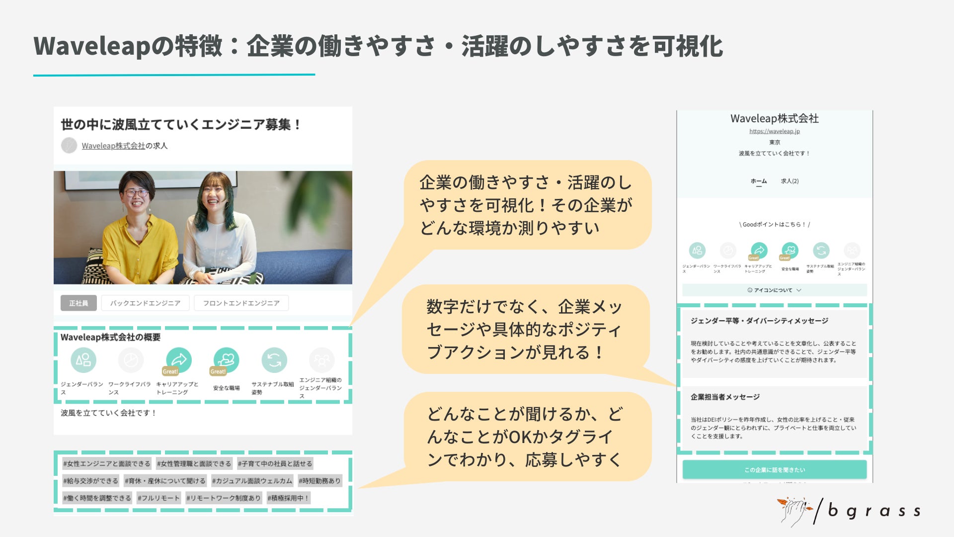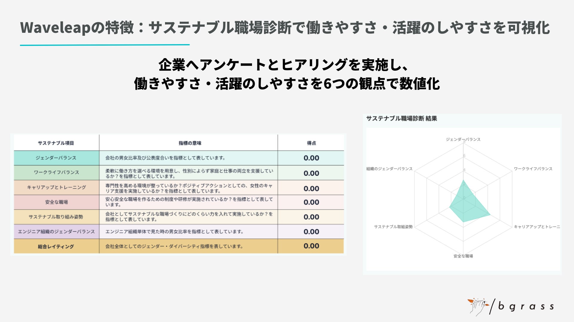 「Waveleap」(https://lp.waveleap.jp/)は、技術もライフも諦めず、IT業界で持続的に働いていきたい、女性・ITエンジニアのための厳選マッチングサービスです。「Waveleap」は、厳選されたサステナブルに働ける企業のみが登録しており、その登録企業の働きやすさ・活躍のしやすさを、独自のサステナブル職場診断で可視化します。また、掲載企業は「Waveleap」を利用を通してジェンダー平等・ダイバーシティ推進の実施が可能となっています。