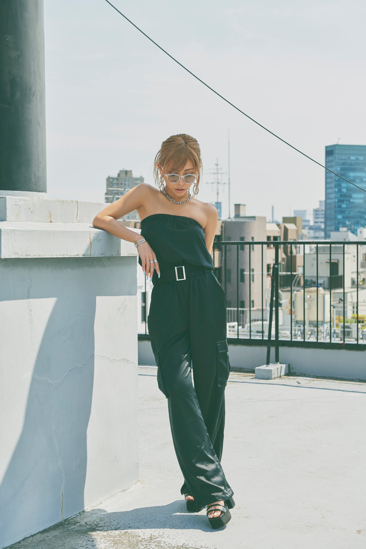 艶感のあるサテン生地にミリタリー要素を加えたベアオールインワン
