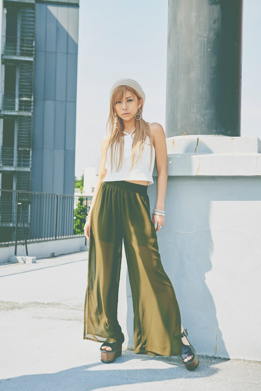 シワ感のない軽やかなシアー素材を使用したレイヤードワイドパンツ