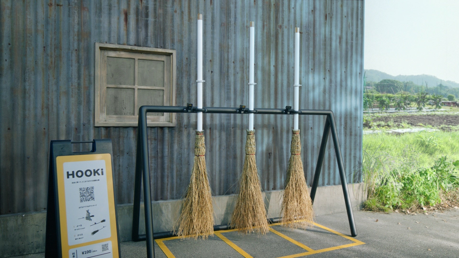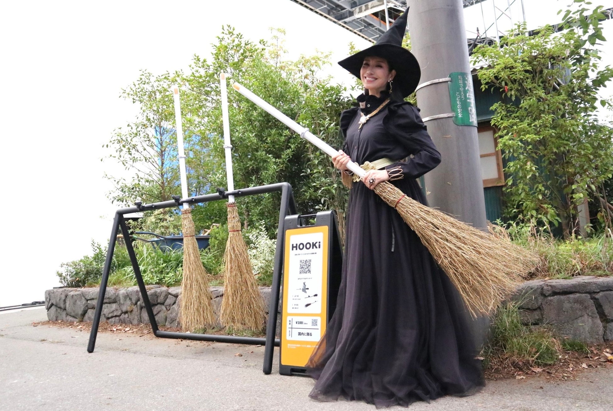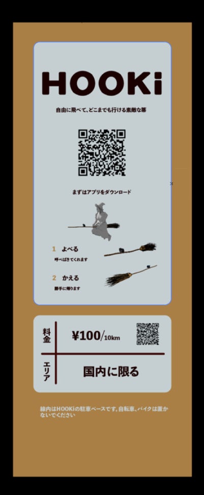 サービス名は「HOOKi」。看板には「自由に飛べて、どこまでも行ける素敵な箒」と記載があり、「HOOKi」の専用アプリをダウンロードするための二次元バーコード、さらに「1.よべる:呼べばきてくれます」「2.かえる:勝手に帰ります」という使い方の説明や、料金は「\100/10km」、エリアは「国内に限る」など、本当に街中に設置されていそうだけどよく見るとクスッと笑える内容となっています。※二次元バーコードはダミーです。