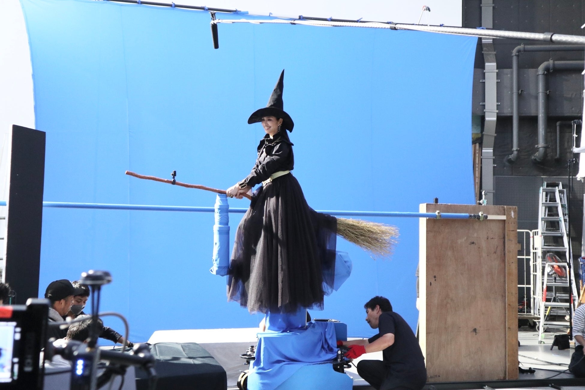 アン ミカさんがインタビューでも、よく聞かれると言われた「空飛ぶ箒の撮影方法」ですが、実はブルーバックの前で昇降式の台の上でまたがって撮影し、あとから背景を合成することで、まるで浮いているかのような映像に仕上がっております。